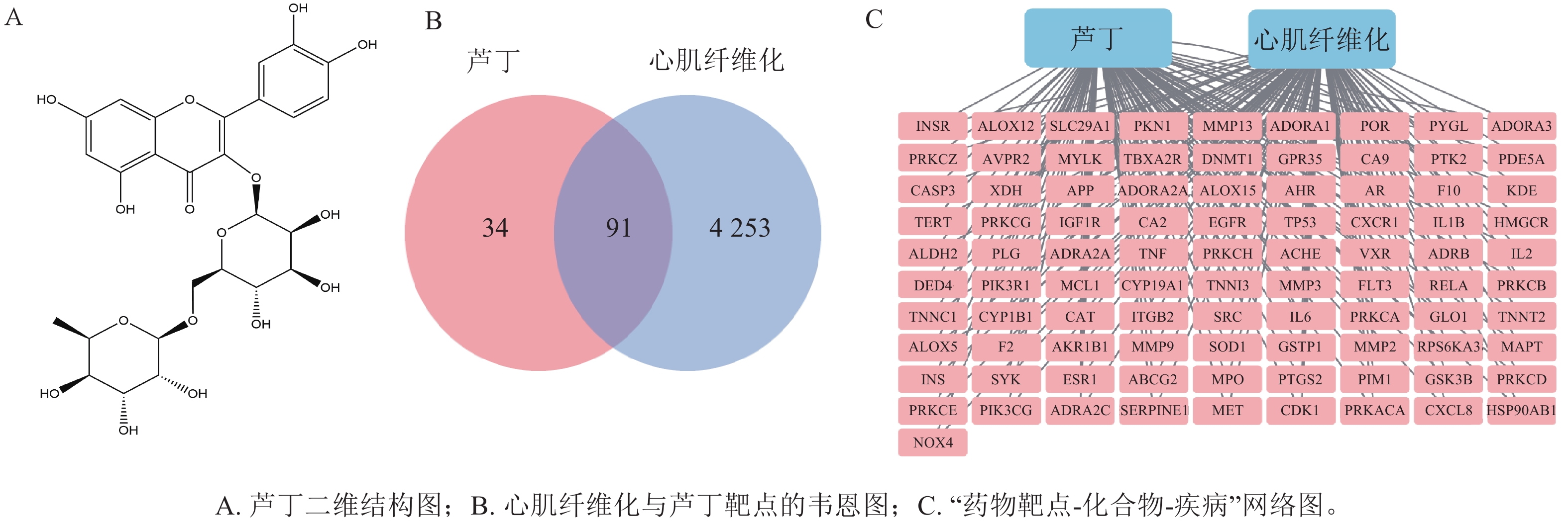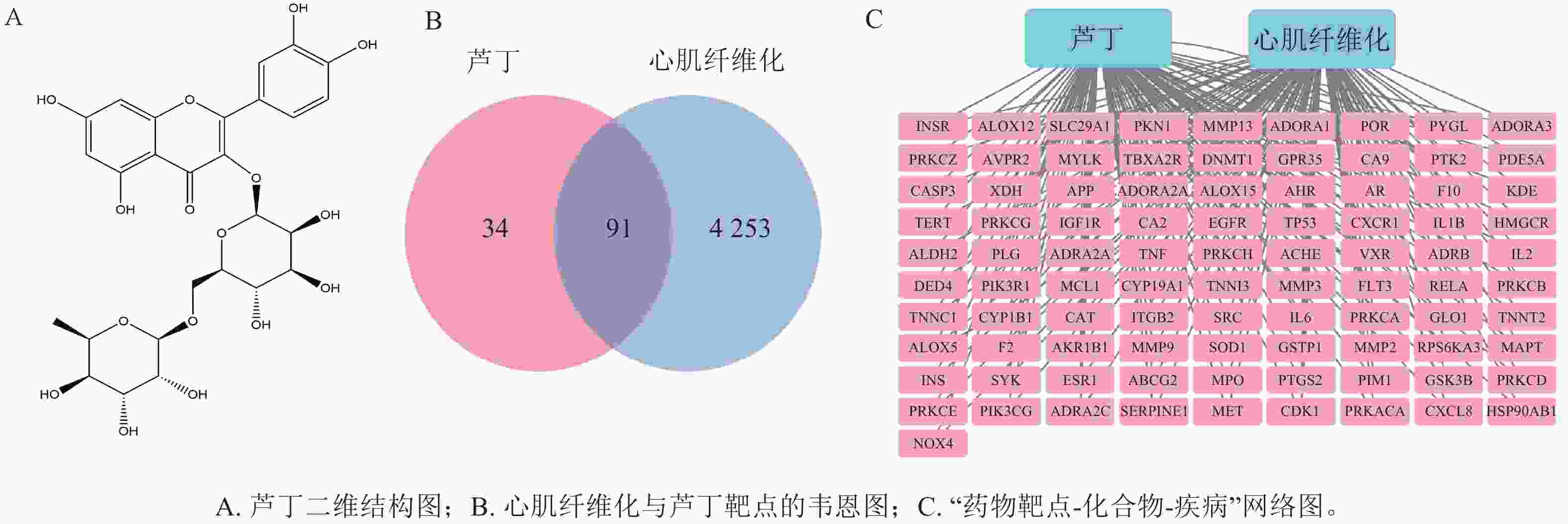 从有机小分子生物活性数据库获取芦丁的结构(图1A)。在中药系统药理学数据库、Swiss Target Prediction数据库、中医药整合药理学研究平台和中药百科全书数据库中共得到芦丁 127个作用靶点。在人类基因数据库、在线人类孟德尔遗传数据库、药物数据库中检索“myocardial fibrosis”,共得到4 344个心肌纤维化疾病靶点。图1B所示:重叠靶点共有91个,导入Cytoscape软件,构建“药物靶点-化合物-疾病”网络(图1C)。