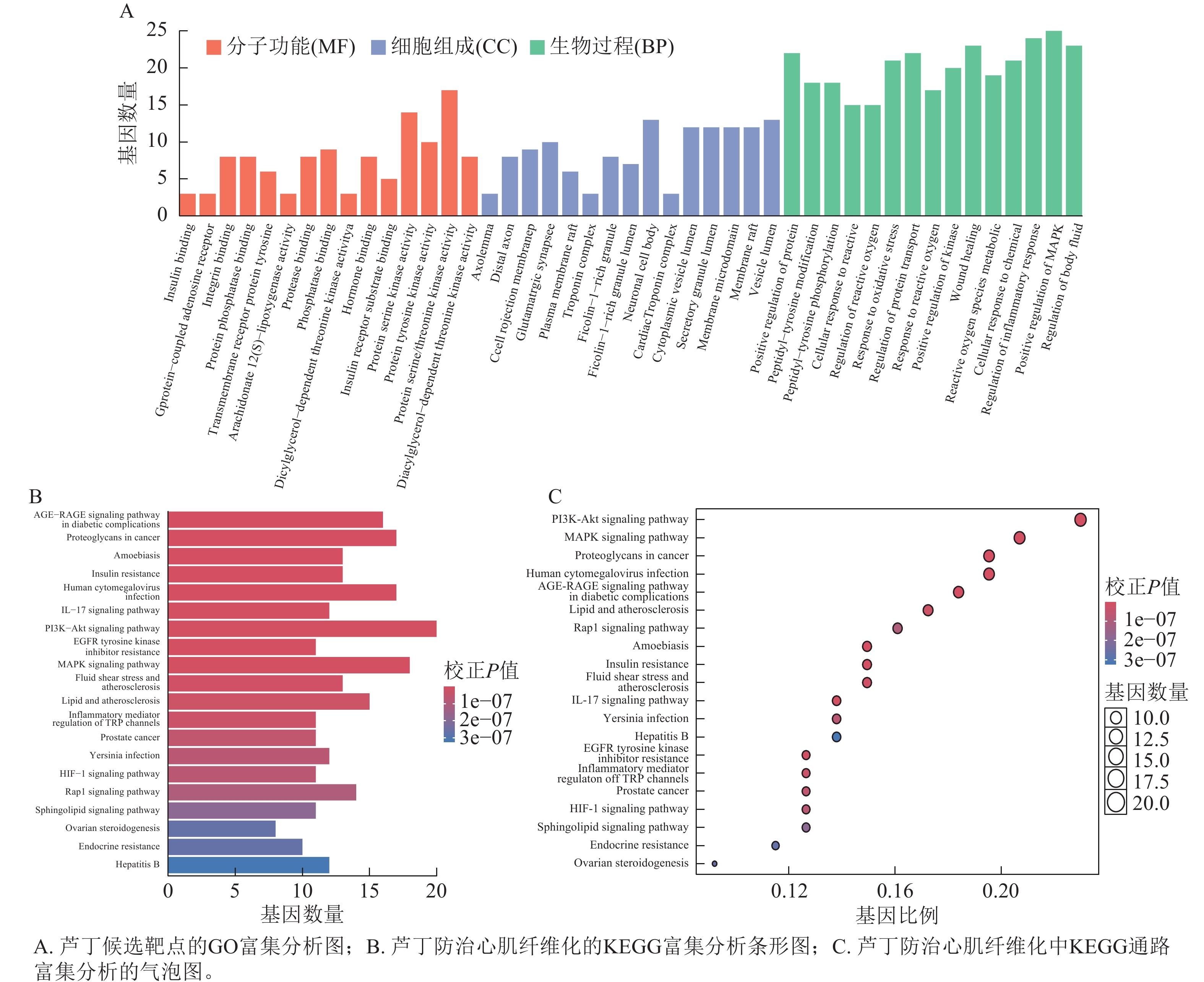 1178 条,主要涉及正向调节MAPK级联反应等;细胞组成(CC) 38条,主要涉及囊泡腔等1307 个条目(图3A)。KEGG细胞通路富集共得到167个条目,选取P<0.05前20条进行条形图和气泡图的绘制(图3B、C)。芦丁抗心肌纤维化主要涉及PI3K-AKT和MAPK信号通路,以及癌症、脂质和动脉粥样硬化以及神经退行性疾病等通路。其中核心靶点蛋白TNF、TP53与MAPK信号通路中的蛋白密切相关,说明芦丁可能作用于MAPK信号通路起到治疗心肌纤维化的作用。为了研究MAPK通路中芦丁对心肌纤维化的特异性影响,鉴定了参与MAPK信号通路的芦丁靶点基因,包括JNK、ERK。后续将通过体外细胞实验来证明。 -