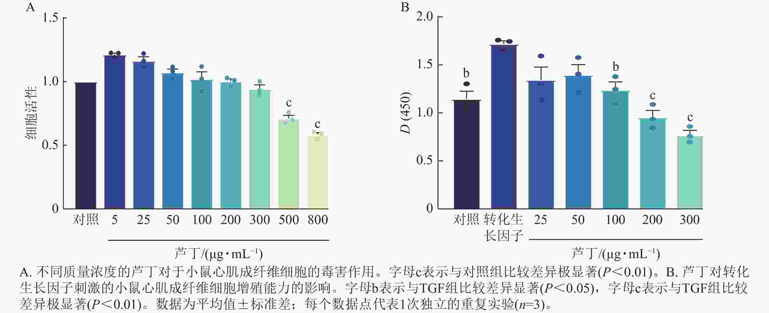 采用CCK-8法测定细胞活性,取对数生长期的小鼠心肌成纤维细胞,按5×104个·mL−1接种在96孔板中,培养12 h,分别用0、5、25、50、100、200、300、500和800 μg·mL−1芦丁处理48 h后,每孔加入10 μL的CCK-8试剂。将CCK-8和DMEM同时添加到没有细胞的孔中(空白对照)。然后用酶标仪测量其在450 nm处的吸光度[D(450)],每组设置6个复孔。采用以下公式计算细胞活性:细胞活性=(给药处理细胞的D(450)−空白对照的D(450))/[给药质量浓度为0的D(450)−空白对照的D(450)]。确认无毒药物浓度后,相同细胞浓度铺板培养12 h,设置对照组、模型组(10 ng·mL−1 TGF-β1)、给药组(10 ng ·mL−1 TGF-β1+25、50、100、200、300 μg·mL−1芦丁)处理48 h后按相同方法测试其在450 nm处吸光度[D(450)]。