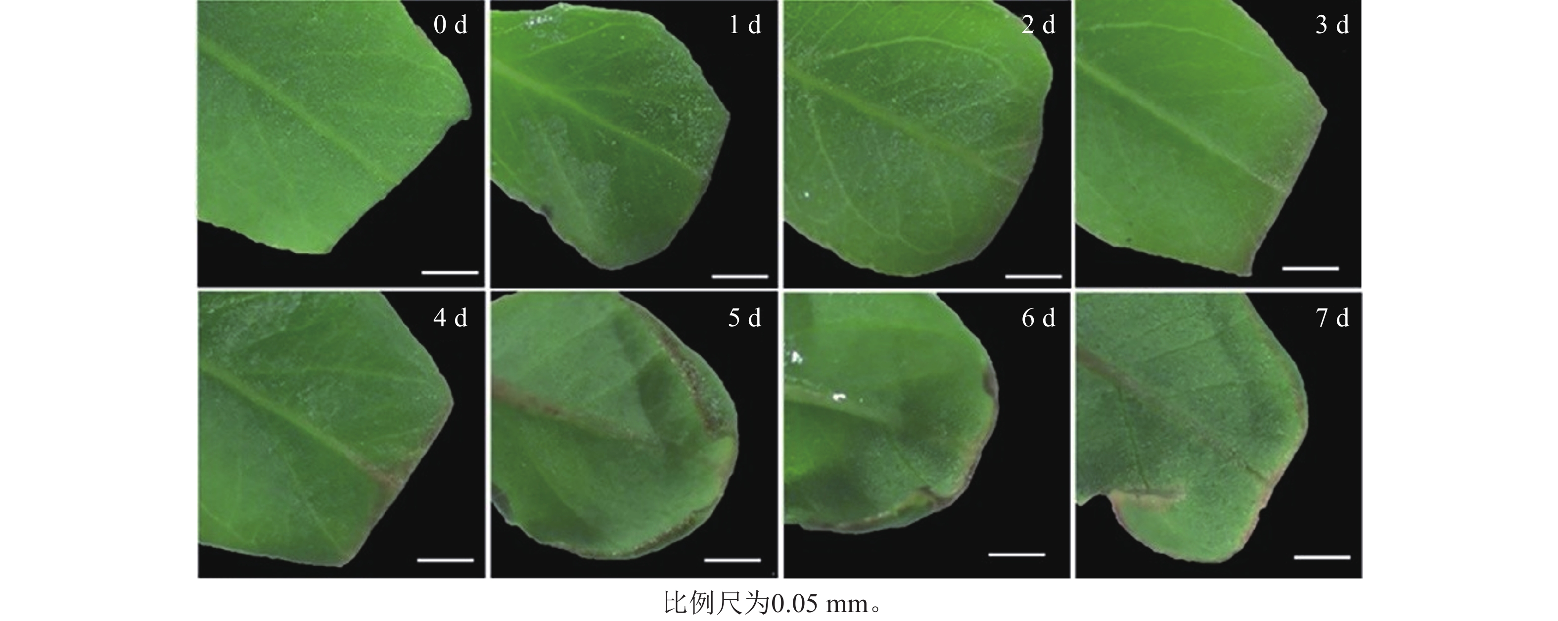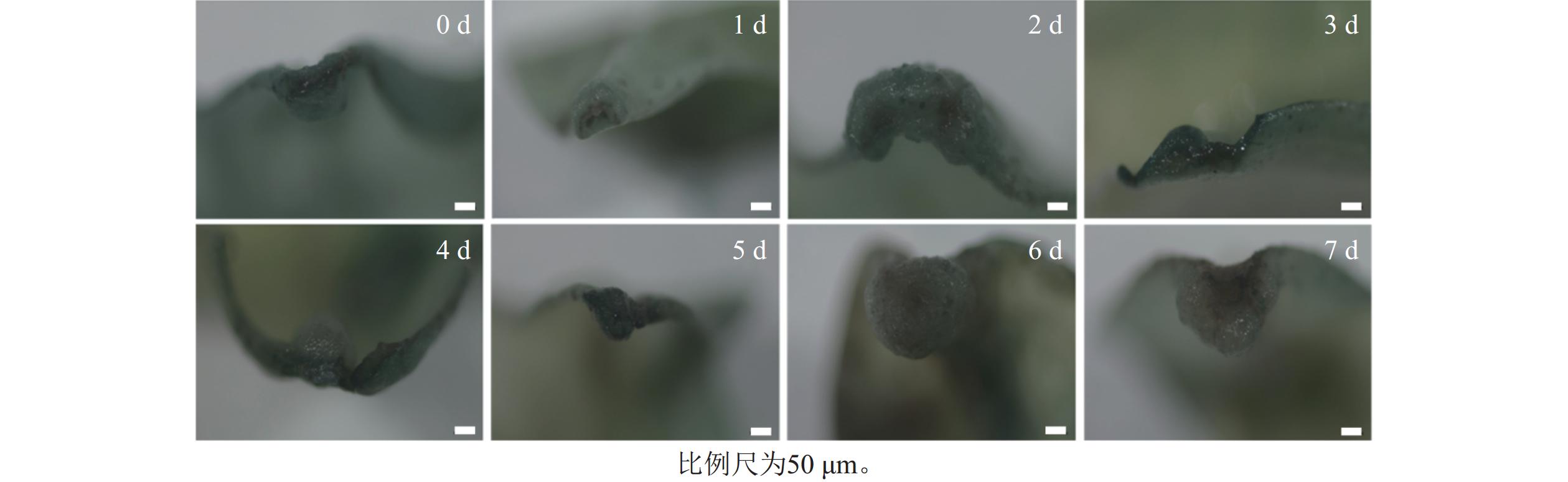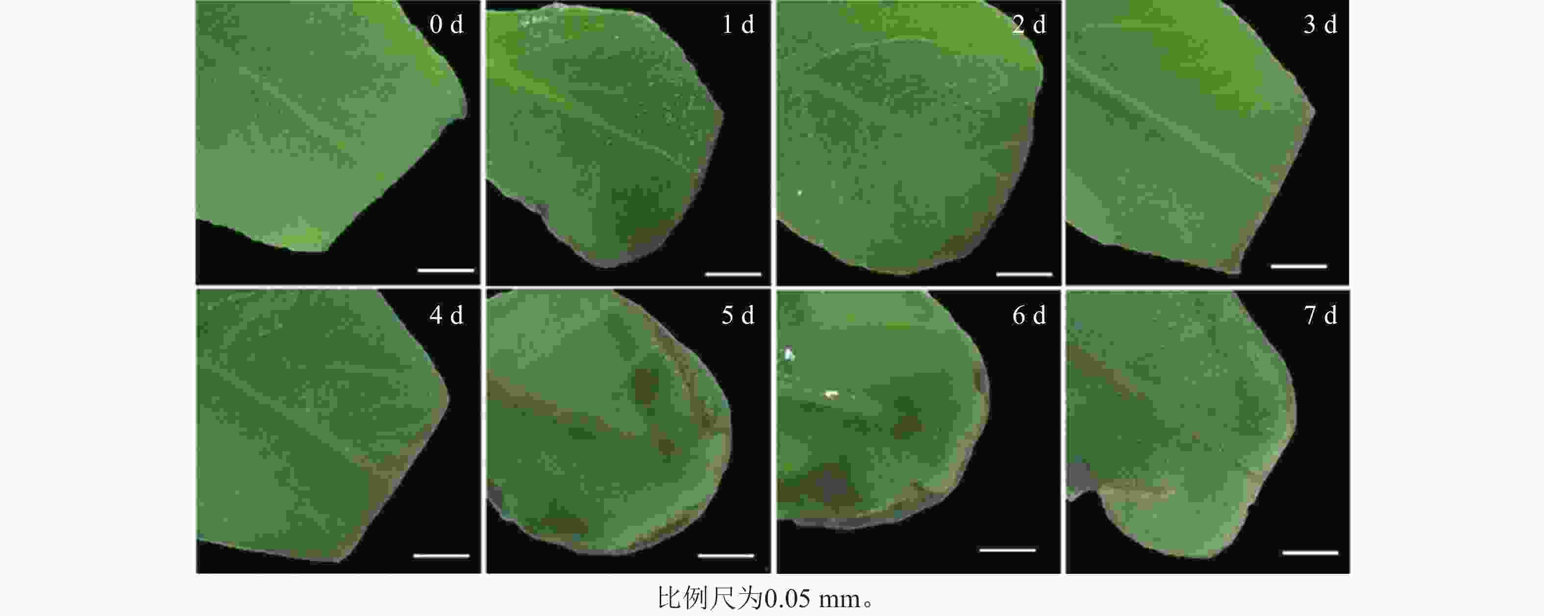 • 图6表明:随着预培养时间的延长,叶片逐渐卷曲,离体培养0~2 d的桉树叶片切口处湿润,切口处为绿色,整个叶片平整无皱缩;培养3 d后,叶片切口处开始变得干燥,且小部分切口转为红色;培养4 d后,尾巨桉叶片开始卷曲,且切口处干燥和起皱明显;5 d观察到少量愈伤组织形成;6~7 d愈伤组织大量出现。切口处干燥皱缩,几乎整个切口变为红色。因此,可推断当叶片切口开始干燥且变红时,是进行遗传转化的最佳处理时间。