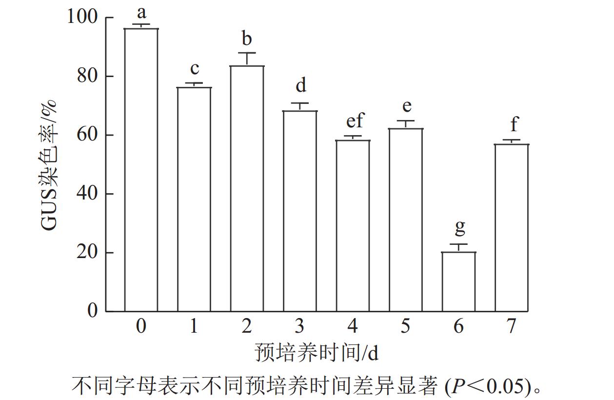 植物遗传转化是分子育种的关键步骤[78],不仅可用于鉴定基因功能,还可以用于改良植物品种的短板性状,尤其适用于育种世代周期较长的树种,实现其目标性状的遗传改良[9]。预培养时间是遗传转化研究中讨论较多的影响因素之一。有研究表明:处于分裂期或代谢活跃期的“感受态细胞”更容易被根癌农杆菌Agrobacterium tumefaciens感染而转化。预培养有利于外植体在切口处形成微愈伤,改变其生理生化状态,促进受体细胞分裂,提高细胞代谢活性,易于整合外源DNA,提高转化率[10]。预培养时间过短,细胞未进入最佳分化阶段;预培养时间过长,外植体伤口会产生保护层,阻碍农杆菌与分裂细胞的接触,因此,适宜的预培养时间可显著提高农杆菌转化效率[11]。一般1~4 d的预培养时间较为适宜[12]。此外预培养时间的长短与物种和外植体类型有关,石榴Punica granatum嫩茎为受体材料时,遗传转化过程中预培养3 d的转化率最高[11]。香蕉Musa nana最佳的预培养时间为1 d,转化效率最高达6.87%[13]