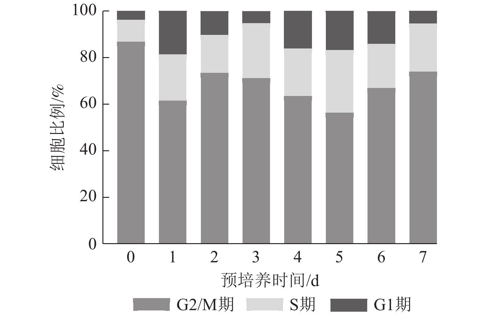 • 预培养0 d时G2/M期细胞比例最高,1~7 d时S期细胞占比均高于0 d,且在整个预培养时间中,S期细胞在预培养5 d时比例最高,为26.88%,而在预培养5 d时,G2/M期细胞占比为56.12%,G1期细胞为17.00%。预培养3 d时,S期细胞占比为23.54%,仅次于处理5 d。表明尾巨桉DH32-29叶片离体预培养3~5 d为最佳遗传转化时间(图3)。