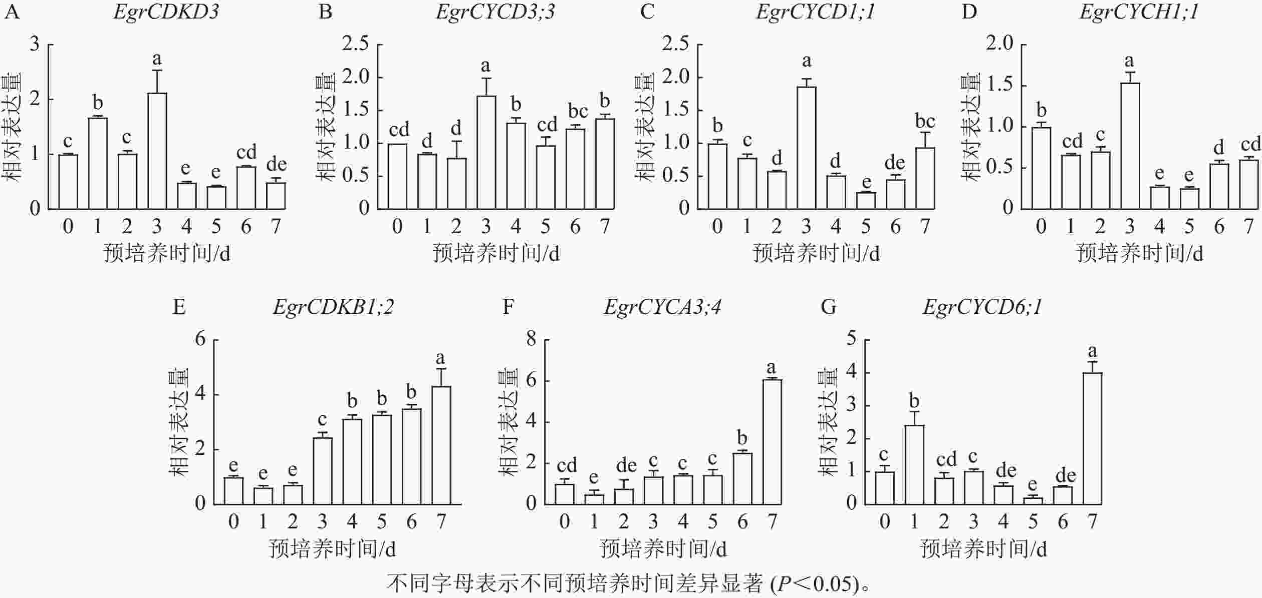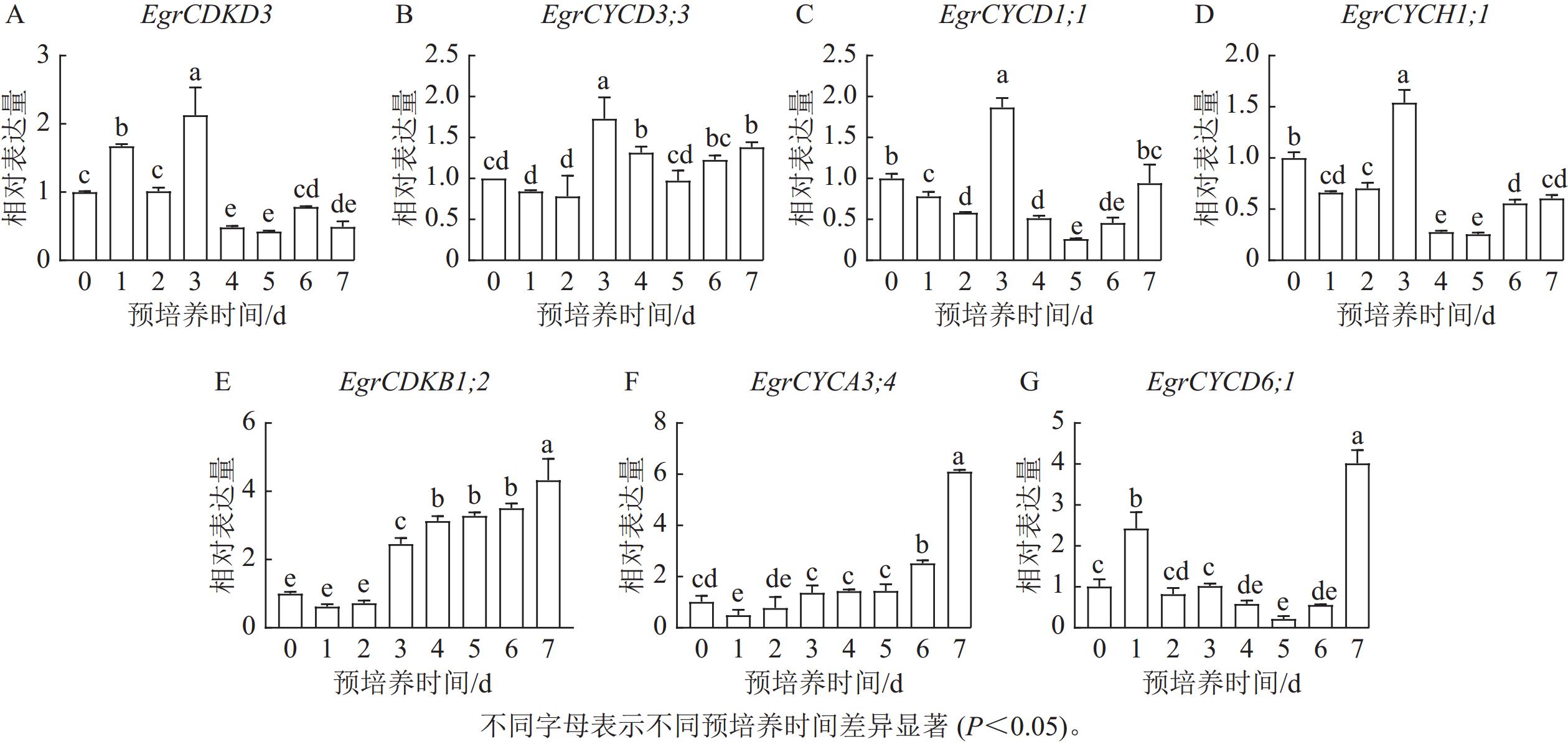 • 图5表明:细胞周期EgrCDKD3离体培养1 d时表达量升高,显著高于0 d (P< 0.05),2 d后迅速升高,但4 d后表达量降低。细胞周期EgrCYCD3;3EgrCYCD1;1在0~2 d表达量逐渐递减,但在3 d时表达量显著升高后迅速下降(P<0.05),2 d时表达量升高,3 d时表达量最大,4 d时表达量迅速下降,之后表达量逐渐升高。S期关键基因EgrCDKD3EgrCYCD3;3EgrCYCD1;1EgrCYCH1;1均在3 d时表达量达到峰值,这与EdU染色结果一致。但EgrCDKB1;2EgrCYCA3;4EgrCYCD6;1在G2/M期发挥作用,在预培养7 d时,在桉树叶片中达到最高值。综上所述,尾巨桉DH32-29叶片离体预培养3~4 d为最佳遗传转化时间。