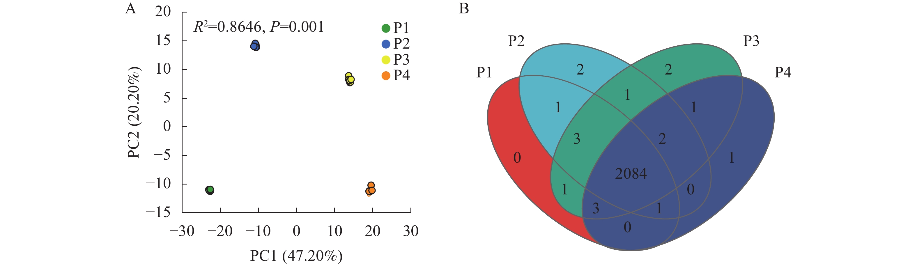 Figure 1. Principal component analysis (PCA) (A) and Venn diagram (B) of wheat root exudates under different P treatments