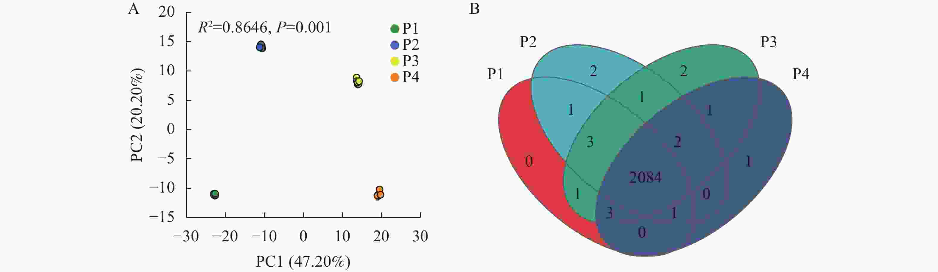图 1 不同供磷水平处理小麦根系分泌物的主成分(PCA)分析(A)和维恩图分析(B)