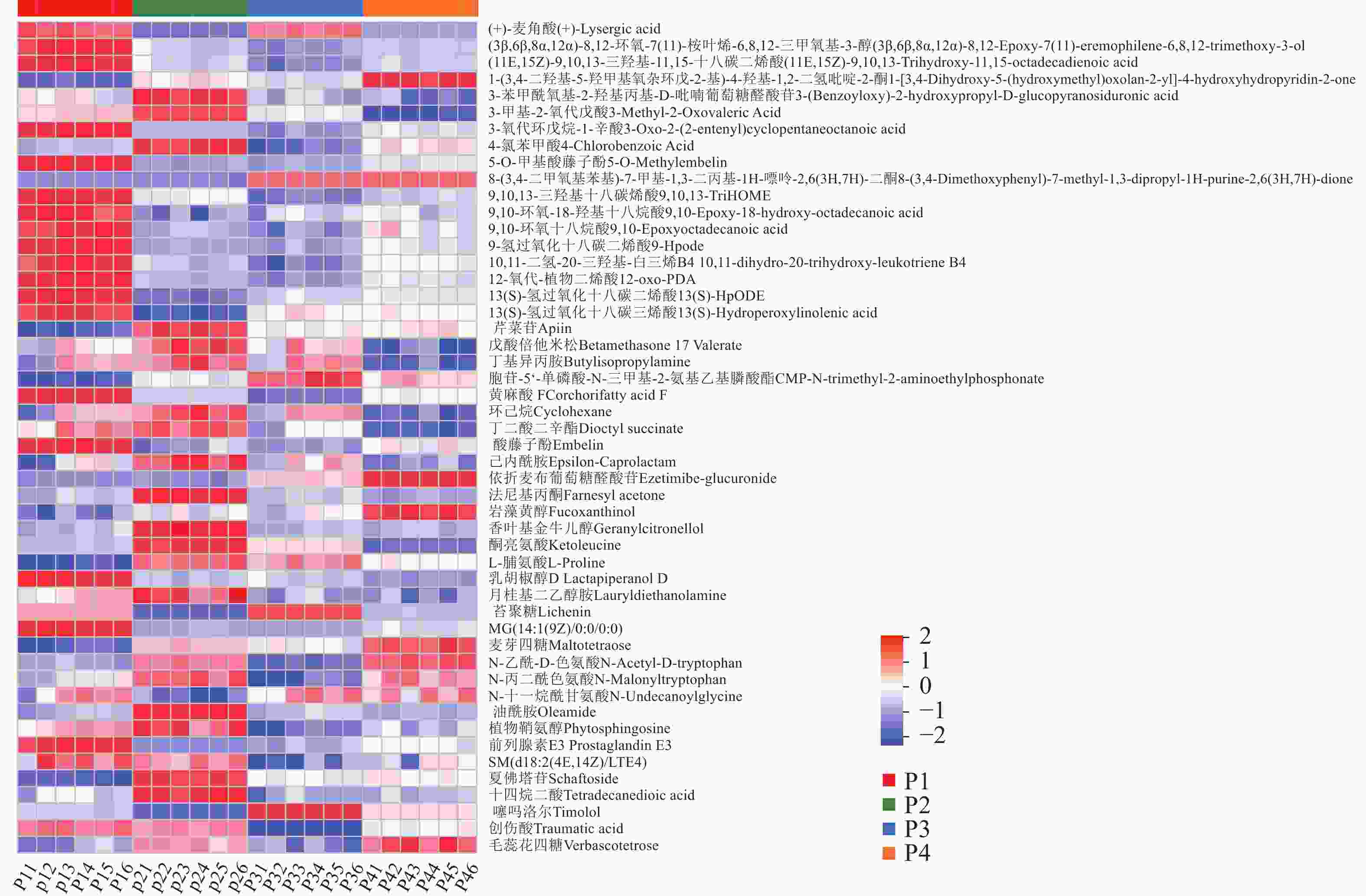 通过热图分析不同供磷水平的小麦根系分泌物组成特征,结果如图2所示。P1处理有17种物质富集,如13-羟基过氧化亚麻酸、9,10-环氧-18-羟基十八烷酸、13(S)-氢过氧化亚油酸等。相对于P1处理,P2处理有23种物质富集,如油酸酰胺、法尼基丙酮、香叶基香茅醇等,P3处理有8种物质富集,如(+)-麦角酸、地衣淀粉、噻吗洛尔等。P4处理有8种物质富集,如依折麦布葡萄糖醛酸苷、岩藻黄醇、麦芽四糖等。反映了不同供磷水平处理根系分泌物存在组成差异。