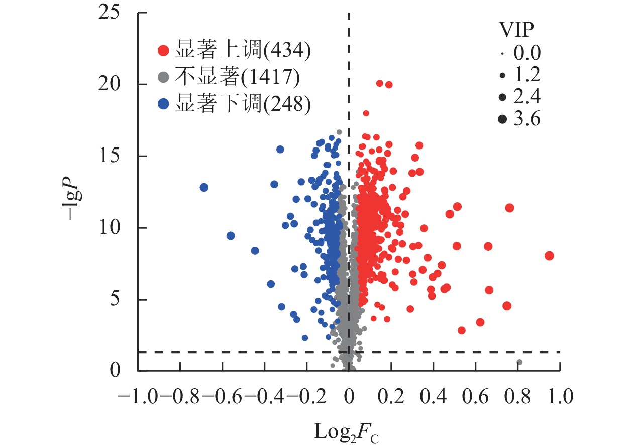 将LC-MS原始数据导入代谢组学处理软件Progenesis QI(Waters Corporation,美国)进行基线过滤、峰识别、积分、保留时间校正、峰对齐,最终得到保留时间、质荷比和峰强度的数据矩阵,数据矩阵用80%规则来去除缺失值,即保留至少一组样品中非零值80%以上的变量,再进行填补空缺值(原始矩阵中最小值填补空缺值),为减小样品制备及仪器不稳定带来的误差,用总和归一化法对样本质谱峰的响应强度进行归一化,得到归一化后的数据矩阵。同时删除质量控制(QC)样本相对标准偏差(RSD)>30%的变量,并进行对数化(lg)处理,得到最终用于后续分析的数据矩阵。同时将LC-MS质谱信息与代谢公共数据库京都基因和基因组数据库(KEGG,https://www.kegg.jp/)数据库进行匹配,得到代谢物信息。
