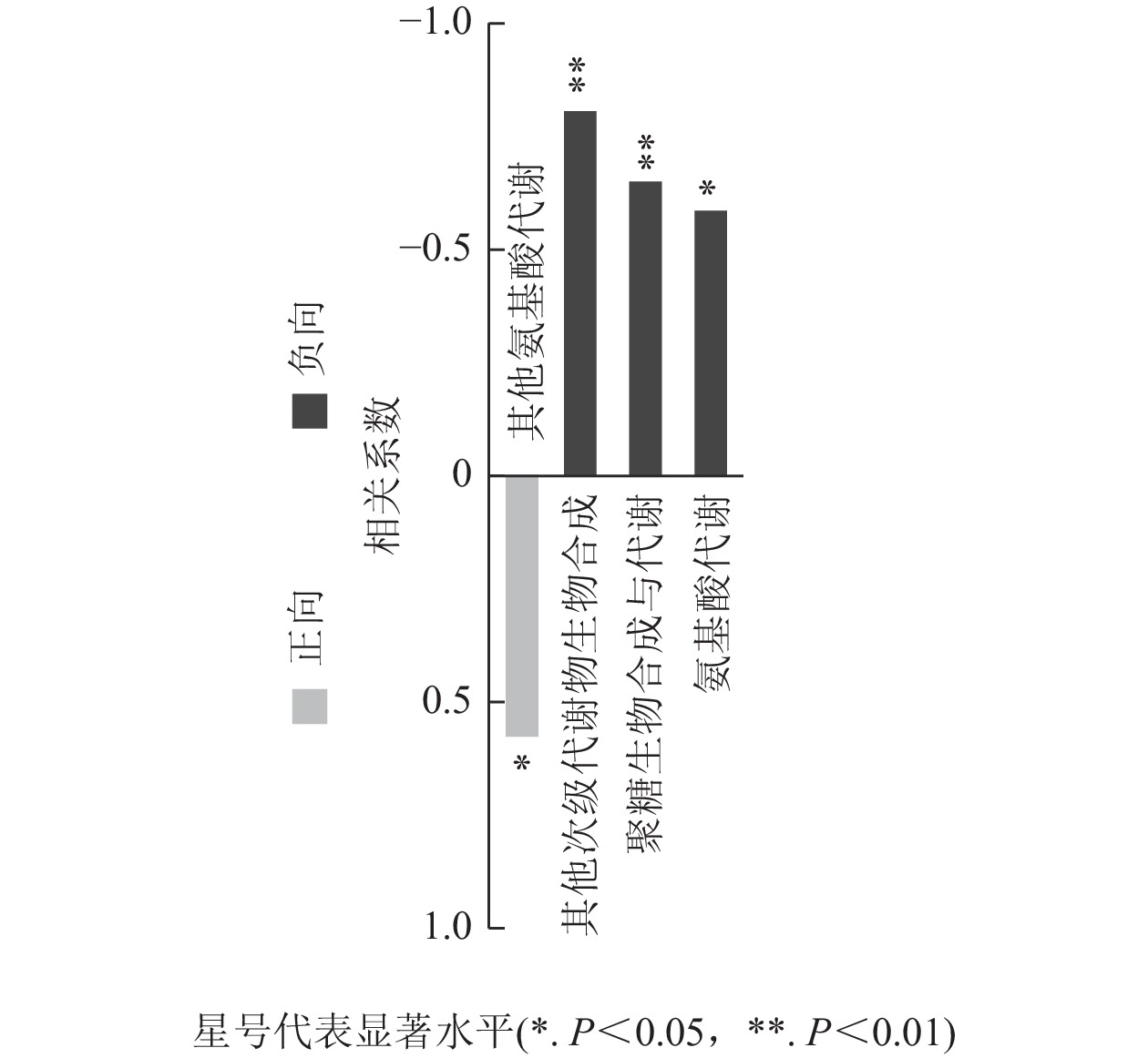 对前面分析得到的P3显著上调的434种与显著下调的248种根系分泌物做iPath分析,其代谢途径结果如图4所示。682种分泌物参与的通路包括聚糖生物合成与代谢、核苷酸代谢、辅因子与维生素代谢、脂质代谢、碳水化合物代谢、氨基酸代谢、其他次生代谢产物的生物合成、能量代谢、萜类化合物和聚酮类化合物的代谢、异种生物降解与代谢、其他氨基酸的代谢。其中,P3处理显著上调分泌物参与的通路多集中在聚糖生物合成与代谢、氨基酸代谢和其他次生代谢产物的生物合成,而显著下调分泌物参与的通路则主要聚集在其他氨基酸代谢,且显著上调和显著下调的两类差异分泌物间没有共同通路。进一步关联分析差异代谢通路与土壤孢囊的相关性,发现P3处理显著上调的3个代谢通路均与孢囊病情指数显著负相关(P<0.05)(图5)。