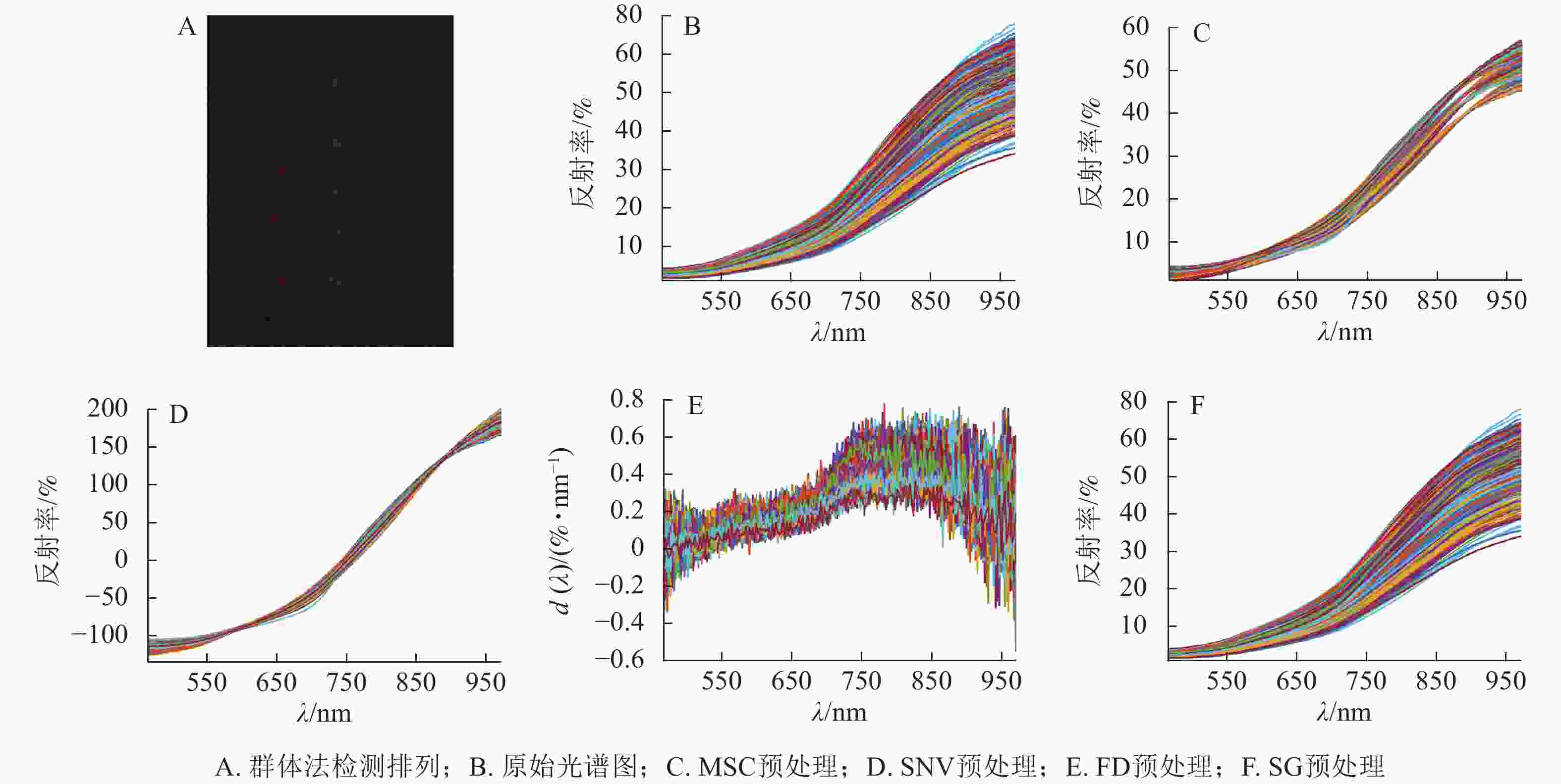 高光谱图像I0上的黑白校正是为了减少光源波动和暗电流的负面影响。将反射率为 99.99%的标准白色校准板放置在与样品相同的高度,扫描收集标准白光校准数据W。用黑色镜头盖盖住镜头,暗场标准黑板图像B被收集。根据公式,计算黑白校正后的光谱数据I。