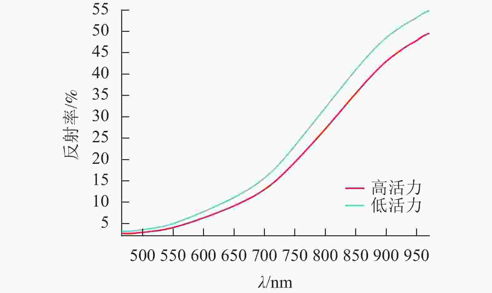 由图4可见:经SG预处理后,噪声被有效平滑,各组样本的平均光谱曲线在关键波段上呈现出明显差异,尤其在650 nm以上的区域,低活力样本与高活力样本之间的反射率差异更为显著。具体来看,高活力种子的平均光谱曲线整体反射率较低,且曲线呈现平滑上升趋势,而低活力种子则在高波段区域显示出较高且波动较大的反射率。这一现象可能与种子在不同劣变状态下的水分含量、细胞完整性以及化学成分变化有关[12]。
