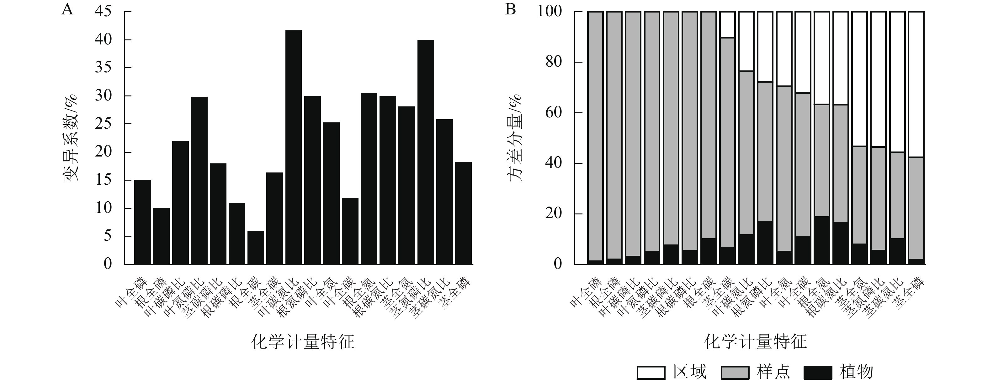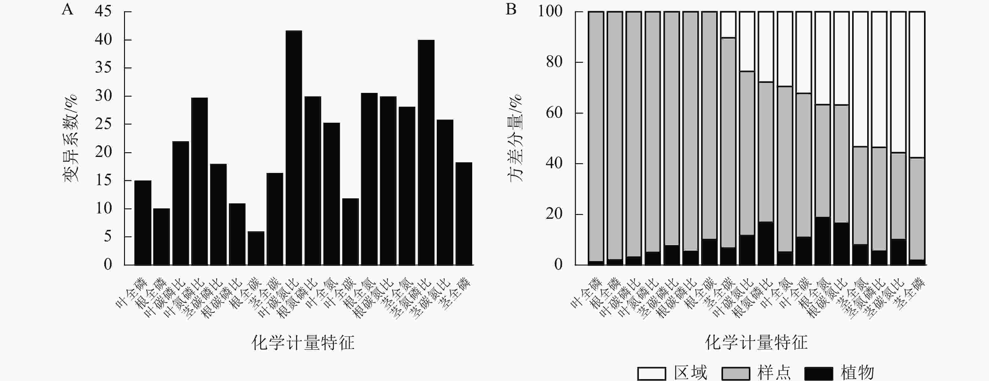 方差分量见图1B。狗尾草化学计量特征的样点水平变异整体高于区域水平变异。在所研究的18个化学计量特征中,仅茎全氮、茎全磷、茎氮磷比、茎碳氮比4个化学计量特征的区域水平变异大于样点水平变异。