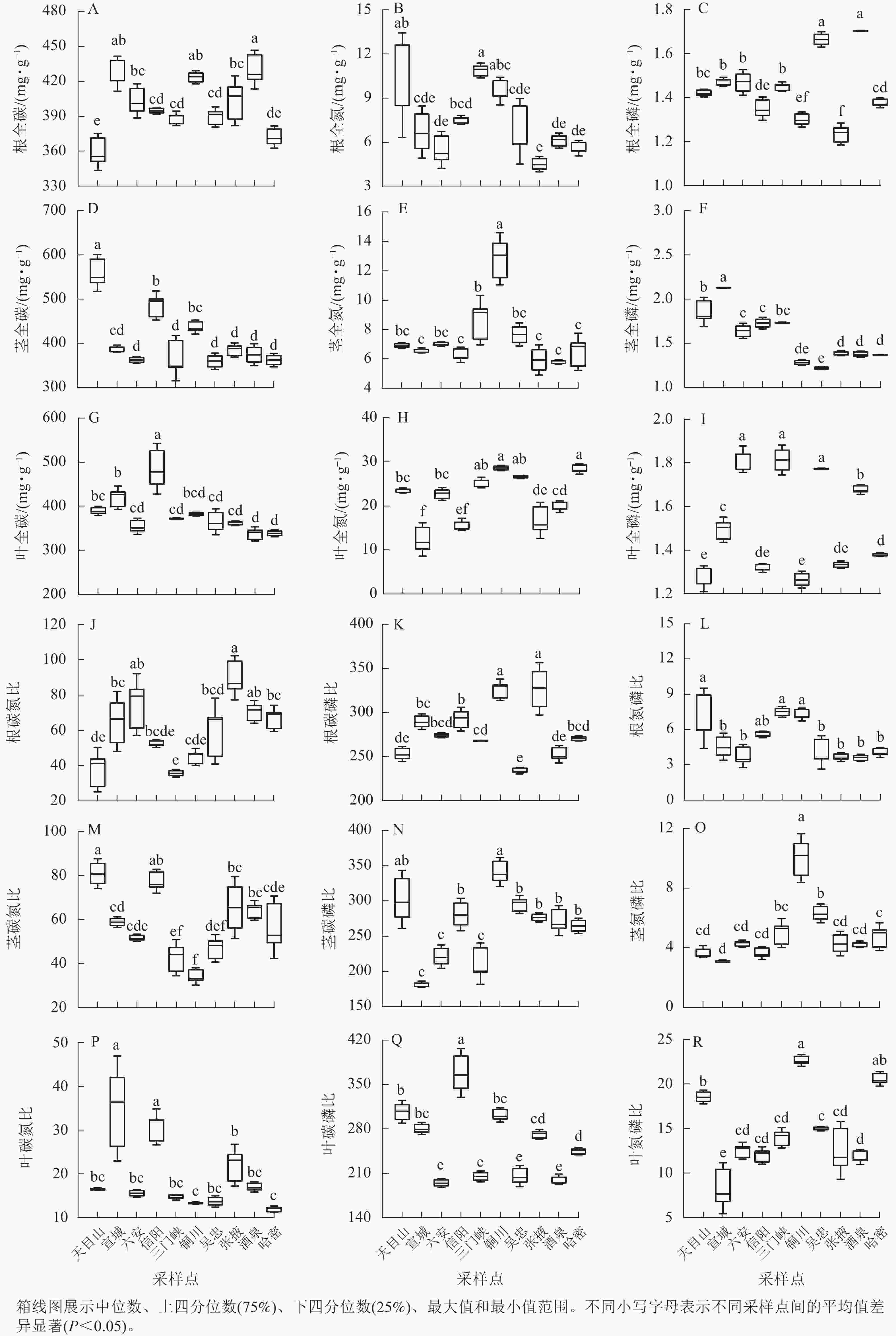 狗尾草化学计量特征在不同样点间的差异见图2。狗尾草各器官化学计量特征在样点间表现出显著差异。其中,氮和氮磷比(N∶P)均为陕西铜川显著大于其他样点(P<0.05),碳质量分数在各样点间变化较小。碳、磷质量分数及其比值在样点间差异显著,但无明显规律。