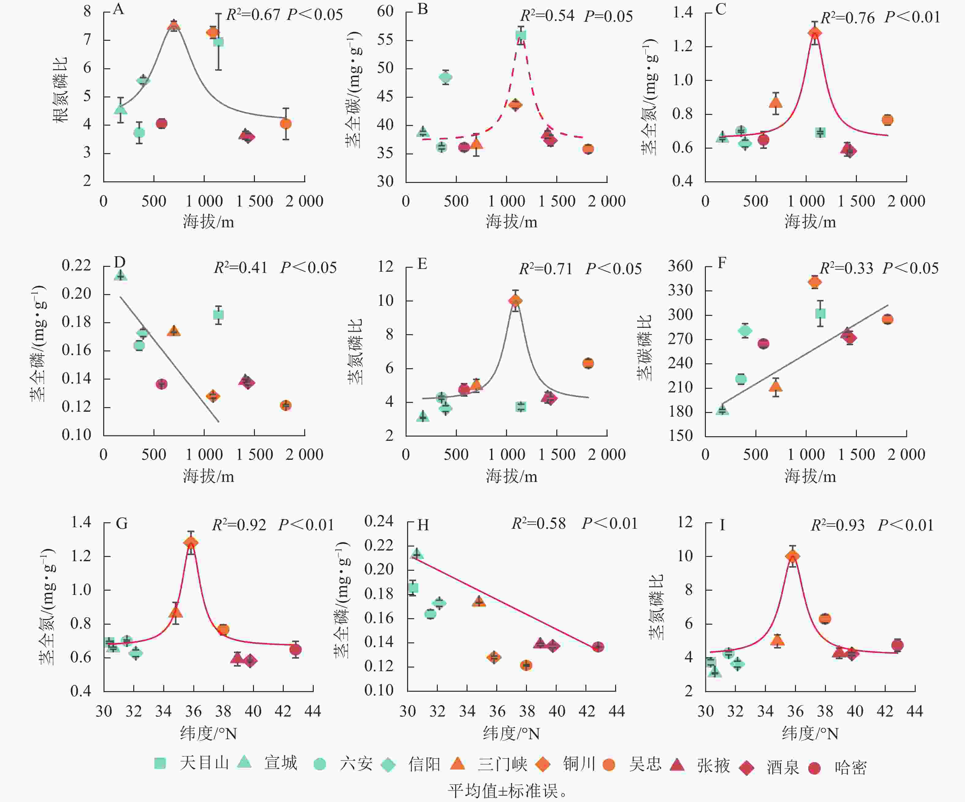 • 狗尾草化学计量特征与样点地理因子(纬度、海拔)的拟合关系见图3。根氮磷比、茎全碳、茎全氮、茎氮磷比与海拔呈单峰关系,茎全磷与海拔呈显著负相关(P<0.05),茎碳磷比与海拔呈显著正相关(P<0.05);茎全氮和茎氮磷比与纬度呈二次曲线关系(P<0.01);茎全磷与纬度呈显著负相关(P<0.05)。