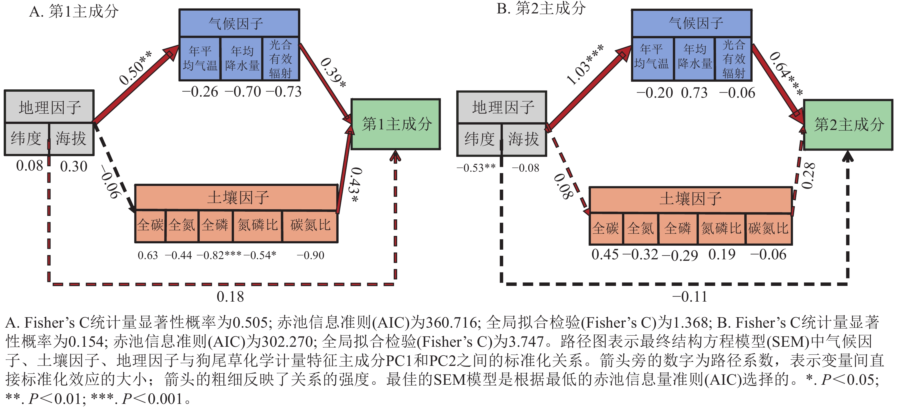 狗尾草化学计量特征的主成分分析见图4。第1主成分的解释率为30.9%,关键化学计量特征为叶氮磷比(载荷为0.88)、茎氮磷比(载荷为0.85)、叶全氮(载荷为0.84)和茎全氮(载荷为0.82);第2主成分的解释率为27.5%,关键化学计量特征为叶碳磷比(载荷为0.94)、茎全碳(载荷为0.81)、叶全碳(载荷为0.80)和叶全磷(载荷为0.75)。根据结构方程模型分析(图5),模型整体拟合良好(卡方检验 P=0.505与0.154)。具体来说,气候因子与土壤因子对狗尾草化学计量特征(第1主成分)均呈显著正向影响(解释率分别为R2= 0.39与R2= 0.43,P<0.05),而地理因子的直接影响不显著,但地理因子对气候因子存在显著影响(R2=0.50,P<0.01)。对于狗尾草化学计量特征(第2主成分),气候因子对狗尾草化学计量特征呈极显著正向影响(R2=0.64,P<0.001),地理因子的直接影响同样不显著。因此,气候和土壤因子在狗尾草化学计量特征沿降水梯度的变化中起主导作用。虽然地理因子不会直接影响狗尾草化学计量特征变异,但它们可以通过对气候和土壤的影响产生间接效应。