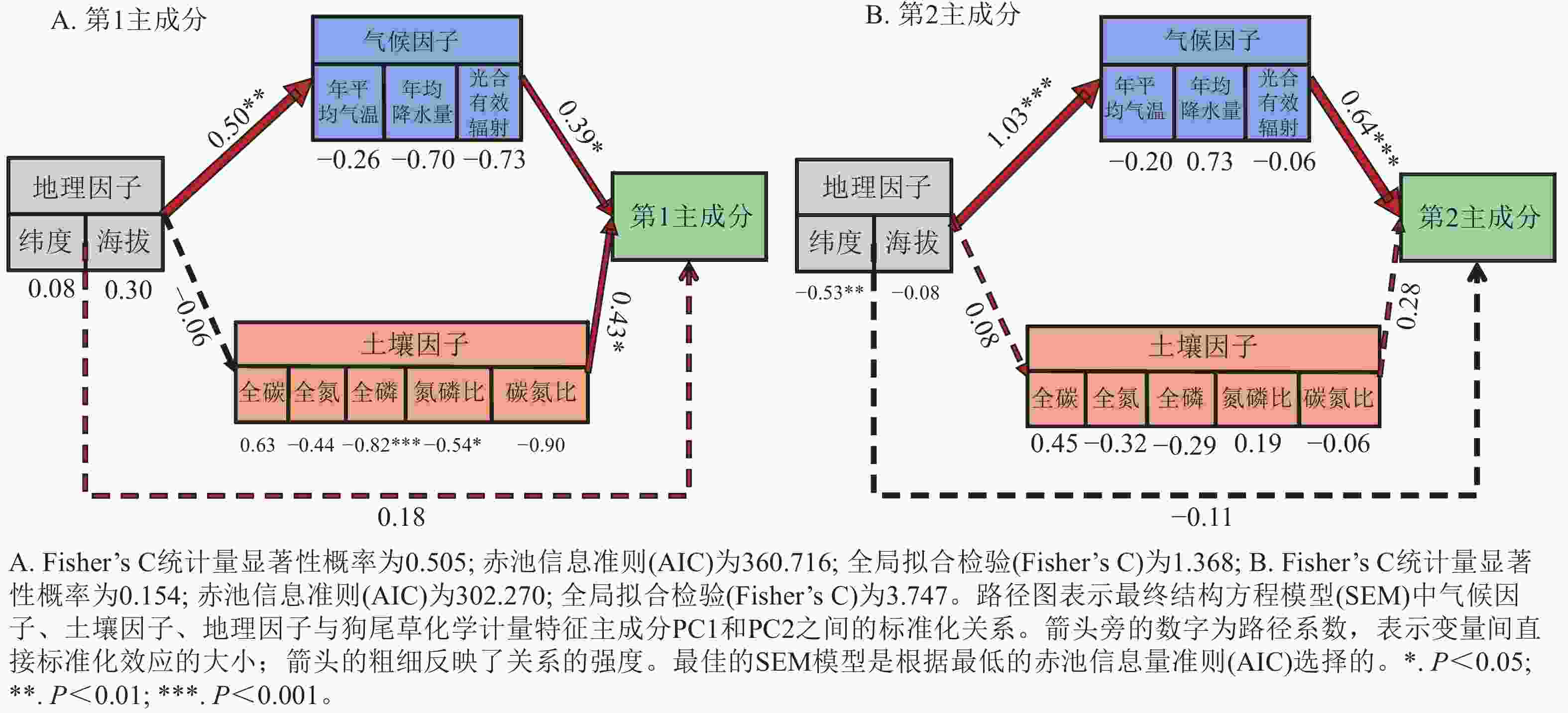 • 摘要:   目的  分析广布种狗尾草Setaria viridis器官间的养分化学计量模式及其驱动因子,揭示狗尾草在大区域尺度下的资源获取策略和生长适应性。  方法  选取中国东南湿润区至西北干旱区降水梯度带上10处样点,以广布种狗尾草为目标植物,测定其根、茎、叶碳、氮、磷化学计量指标,采用单因素方差分析与主成分分析等方法,探究狗尾草化学计量沿降水梯度带的变异规律,用结构方程模型和层次分割法进一步揭示驱动化学计量变异的主要环境因子。  结果  ①狗尾草各器官全碳质量分数变异系数最低(根9.13%,叶11.70%),而全氮、全磷变异较大,反映了限制性元素对环境变化的敏感响应。②纬度与海拔等地理因子对化学计量特征无显著直接效应,其影响主要通过调控气候与土壤条件而间接实现。③器官间环境驱动因子存在分化:根化学计量变异主要由土壤因子解释,茎变异主要受气候因子主导,叶化学计量特征则与年均降水量、光合有效辐射和土壤全磷呈显著正相关(P<0.01)。  结论  狗尾草器官间化学计量特征在不同样点间存在显著分异,主要由环境因子(气候、土壤)驱动。植物的化学多样性是由大尺度气候条件筛选出的基础资源利用策略(第1主成分)与局部土壤异质性(尤其是磷)所细化的具体适应性特征(第2主成分)通过层级调控共同决定的。这些发现强调了从器官尺度理解植物适应性分异的重要性,为更精准地预测未来气候变化下植物的响应与适应轨迹提供了新的视角。图7表2参26