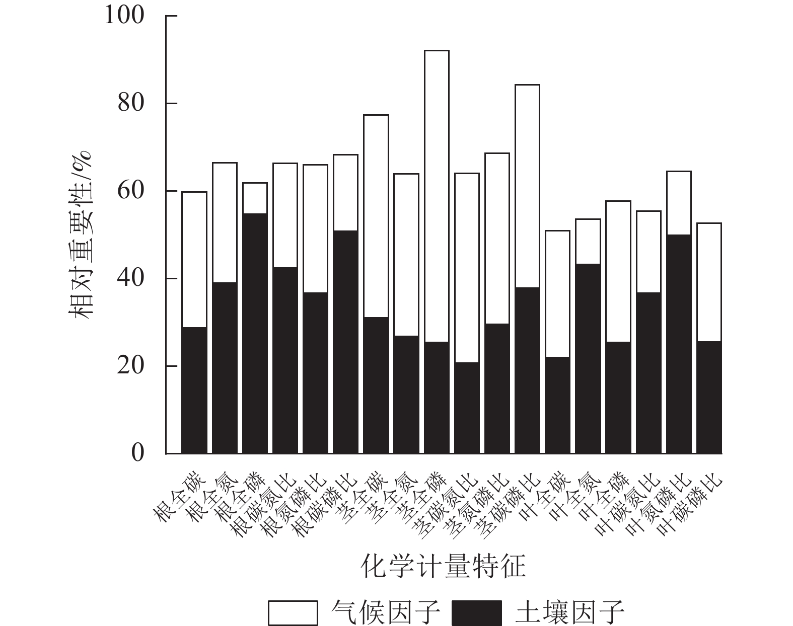 气候与土壤因子被认为是塑造这种器官特异性响应模式的主要驱动力[67]。大尺度研究表明:叶片氮、磷常随年平均气温(MAT)和年均降水量(MAP)增加而降低[5]。然而,不同器官对同一环境因子的响应可能迥异。例如,有研究发现:荒漠植物叶片磷受气候因子显著影响,而茎和根则不然[8];另外,HE等[9]研究表明:根系化学计量与土壤磷、pH等局地因子关系更为密切。由于已有研究结论不一致,驱动植物各器官化学计量特征分异的关键环境因子及其相对重要性仍不明确,因此,亟需通过对多个器官的系统比较来加以厘清。