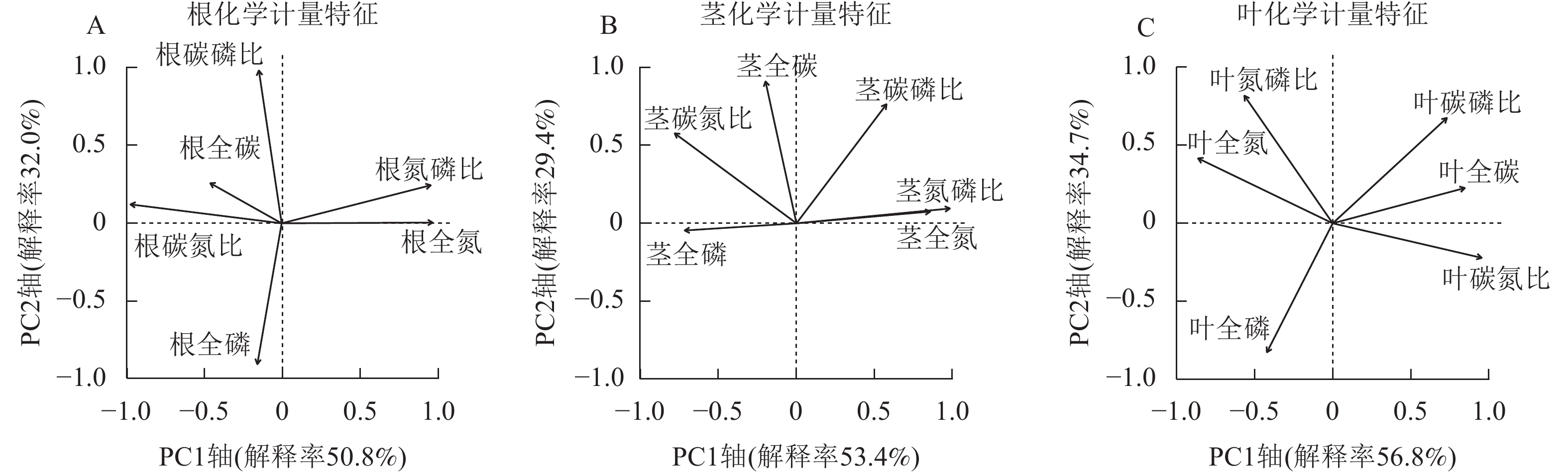 Figure 7.  Principal component analysis of root, stem, and leaf stoichiometric traits in S. viridis