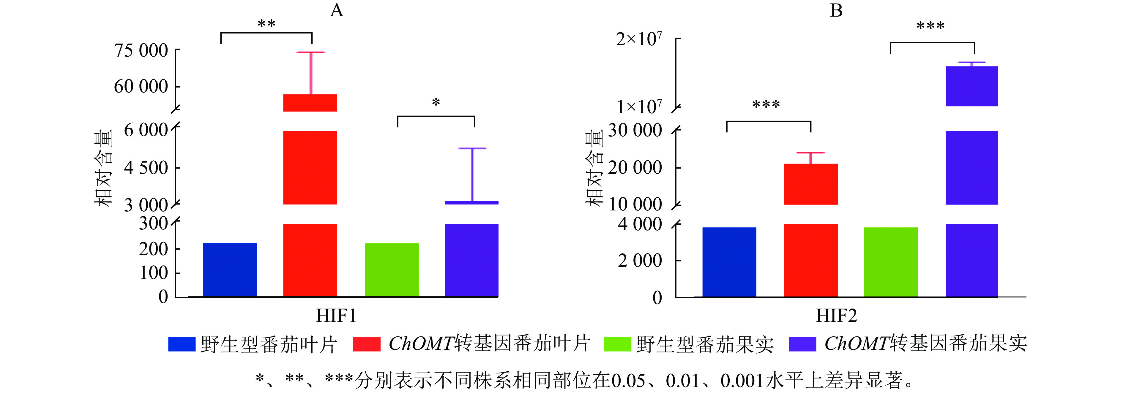 Objective This study aims to construct transgenic homoisoflavones tomato (Solanum lycopersicum) plants based on the homoisoflavones synthase gene ChOMT from alfalfa (Medicago sativa), thereby achieving nutritional fortification of tomatoes. Method ChOMT gene was introduced into tomatoes using agrobacterium-mediated transformation. Transgenic identification was carried out through PCR and fluorescence detection. Furthermore, plant-wide targeted metabolomics technology and multivariate statistical analysis methods were employed for precise quantitative analysis of homoisoflavones content. Result Through PCR and fluorescence detection, positive transgenic plants of ChOMT were obtained. Compared with the wild type, the content of homoisoflavonoids significantly increased. Among them, the relative content of (3RS)-5,7-dihydroxy-3-(2-hydroxy-4-methoxybenzyl)-chroman-4-one (HIF1) in the leaves of transgenic tomatoes was 57019 , which was 260 times higher than the relative content of 220 in the leaves of the wild type. The relative content of 5,7-dihydroxy-3-(4-hydroxybenzyl)-chroman-4-one (HIF2) in the fruits of transgenic tomatoes was 15 849 985, which was over 4 000 times higher than the relative content of 3849 in the wild type. Conclusion ChOMT transgenic tomatoes are obtained, which not only provides a theoretical basis for analyzing the catalytic function of ChOMT in plants, but also lays an important foundation of germplasm resources for breeding genetically improved tomato varieties with high homoisoflavonoid content. [Ch, 6 fig. 28 ref.]