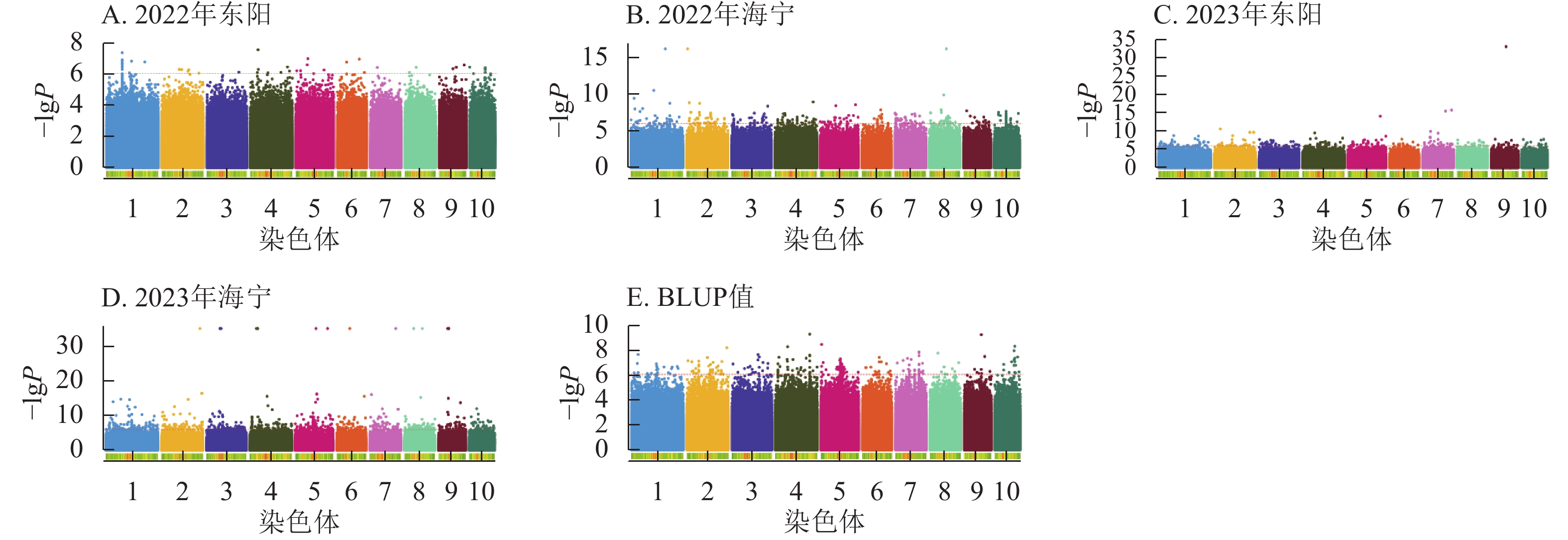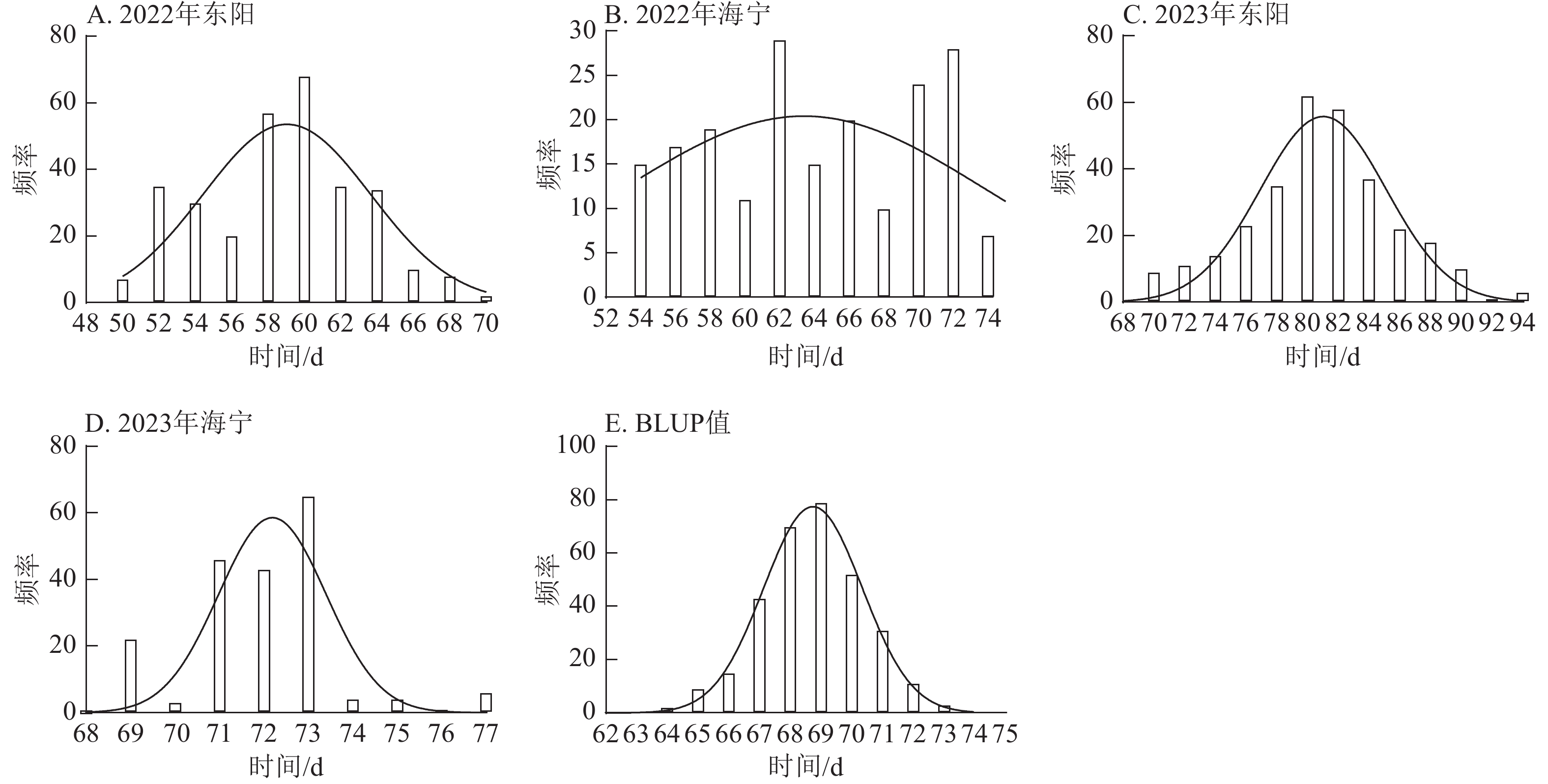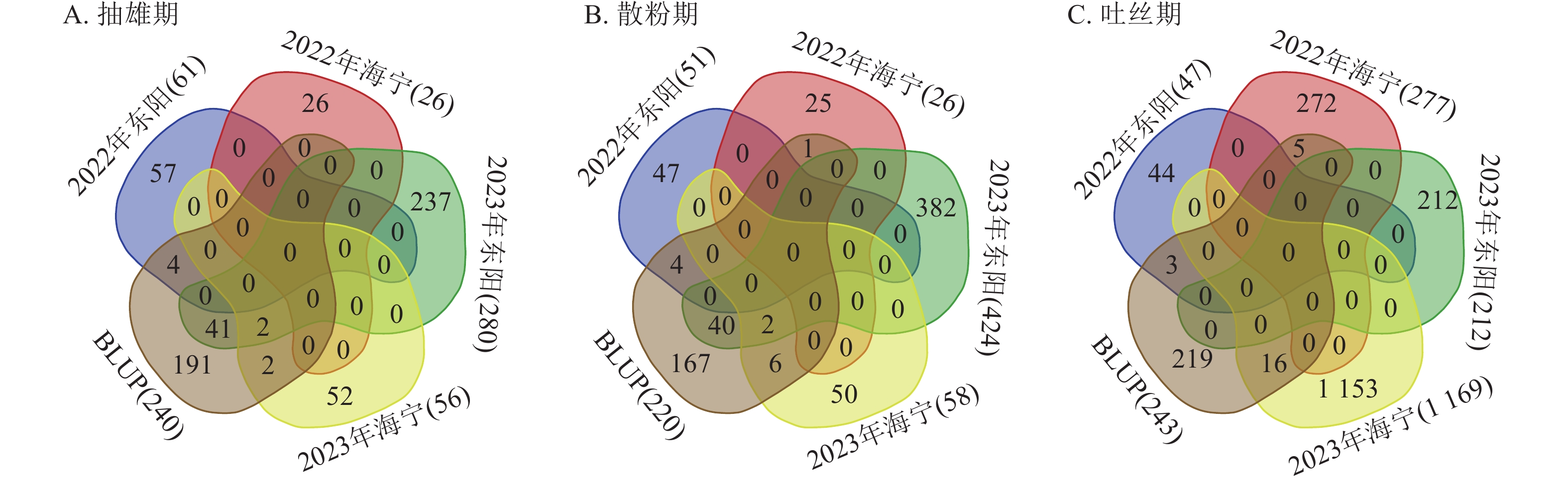 Objective Maize (Zea mays) growth period refers to the complete growth cycle from sowing to maturity, with key representative traits including tasseling stage, anthesis stage, and silking stage. Identifying key genes regulating maize growth period is of great significance for optimizing maize production and promoting industrial quality and efficiency improvement. Method In 2022 and 2023, phenotypic investigations of traits such as tasseling stage, anthesis stage, and silking stage were conducted on 322 maize germplasm resources at 2 locations (Dongyang and Haining, Zhejiang Province). Genome-wide association study (GWAS) was performed on the above traits combined with genotypic resequencing data. Result The frequency distribution of tasseling stage, anthesis stage, and silking stage traits showed a unimodal curve, consistent with a normal distribution. GWAS results revealed: for the tasseling stage, 61, 27, 281, and 57 SNP-associated loci were identified in the 4 experimental sites (Dongyang and Haining in 2022, Dongyang and Haining in 2023) across 322 maize germplasms, explaining phenotypic variation ranging from 7.26% to 10.68% and distributed on all 10 chromosomes. For the anthesis stage, 51, 26, 424, and 58 related loci were identified, explaining phenotypic variation from 7.25% to 11.80% and mainly distributed on chromosomes 1, 2, 3, 7, 8, 9, and 10. For the silking stage, 47, 277, 212, and 1 169 related loci were identified, explaining phenotypic variation from 7.25% to 41.26% and mainly distributed on chromosomes 1, 2, 3, 4, 7, 8, and 10. A total of 49, 53, and 24 overlapping SNP loci were detected for tasseling stage, anthesis stage, and silking stage among the 4 experimental sites, respectively. Through comprehensive analysis of SNP locus information, gene annotation, and gene tissue expression profiles, 6 key candidate genes for maize growth period were finally screened out. Conclusion Tasseling stage, anthesis stage, and silking stage traits showed a normal distribution, and a large number of environment-specific and overlapping SNP loci were identified. Ultimately, 6 key candidate genes for growth period were screened out, providing important genetic resources for the genetic improvement of maize growth period and the high-quality development of the industry. [ Ch, 8 fig. 3 tab. 44 ref.]