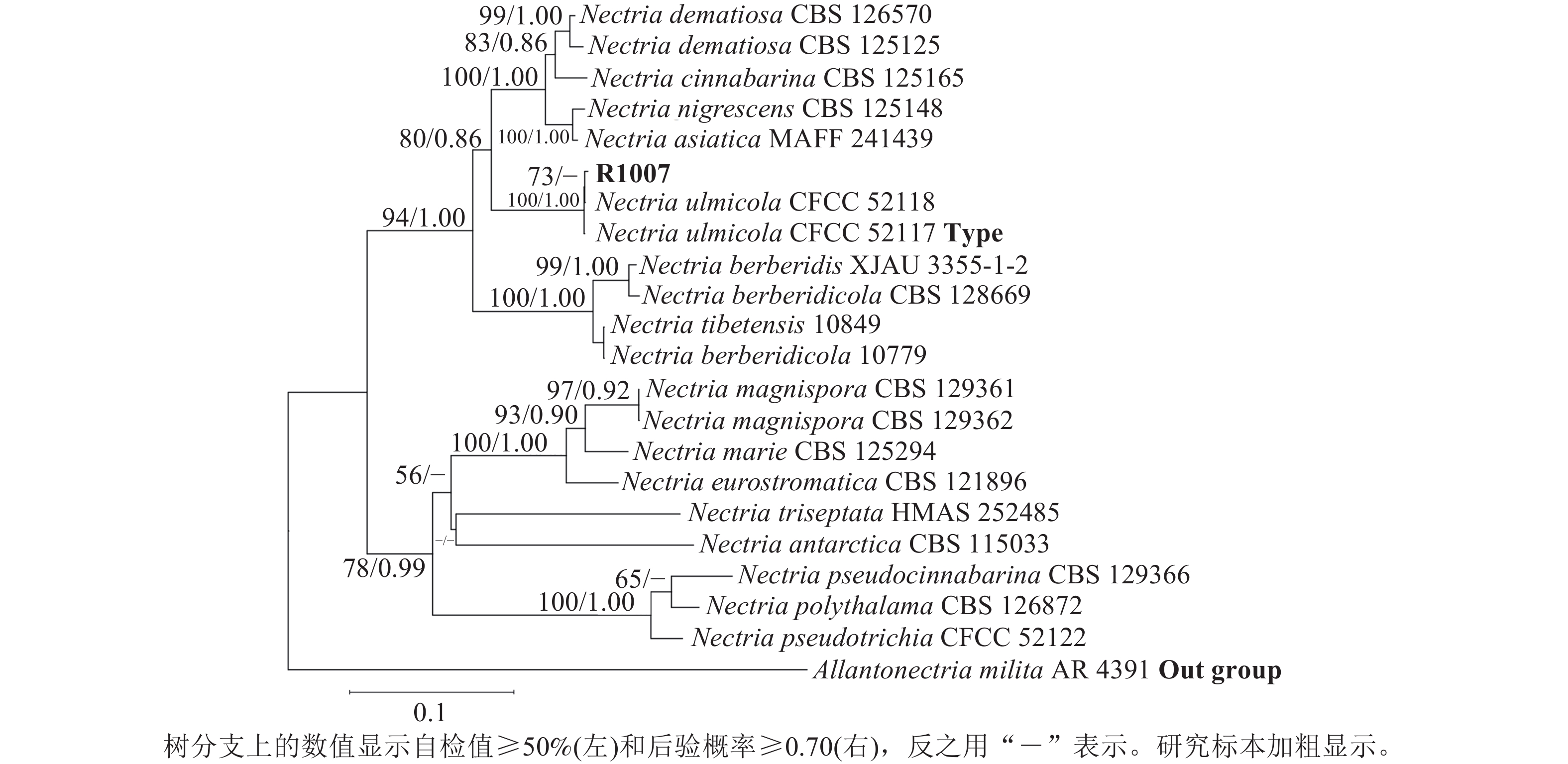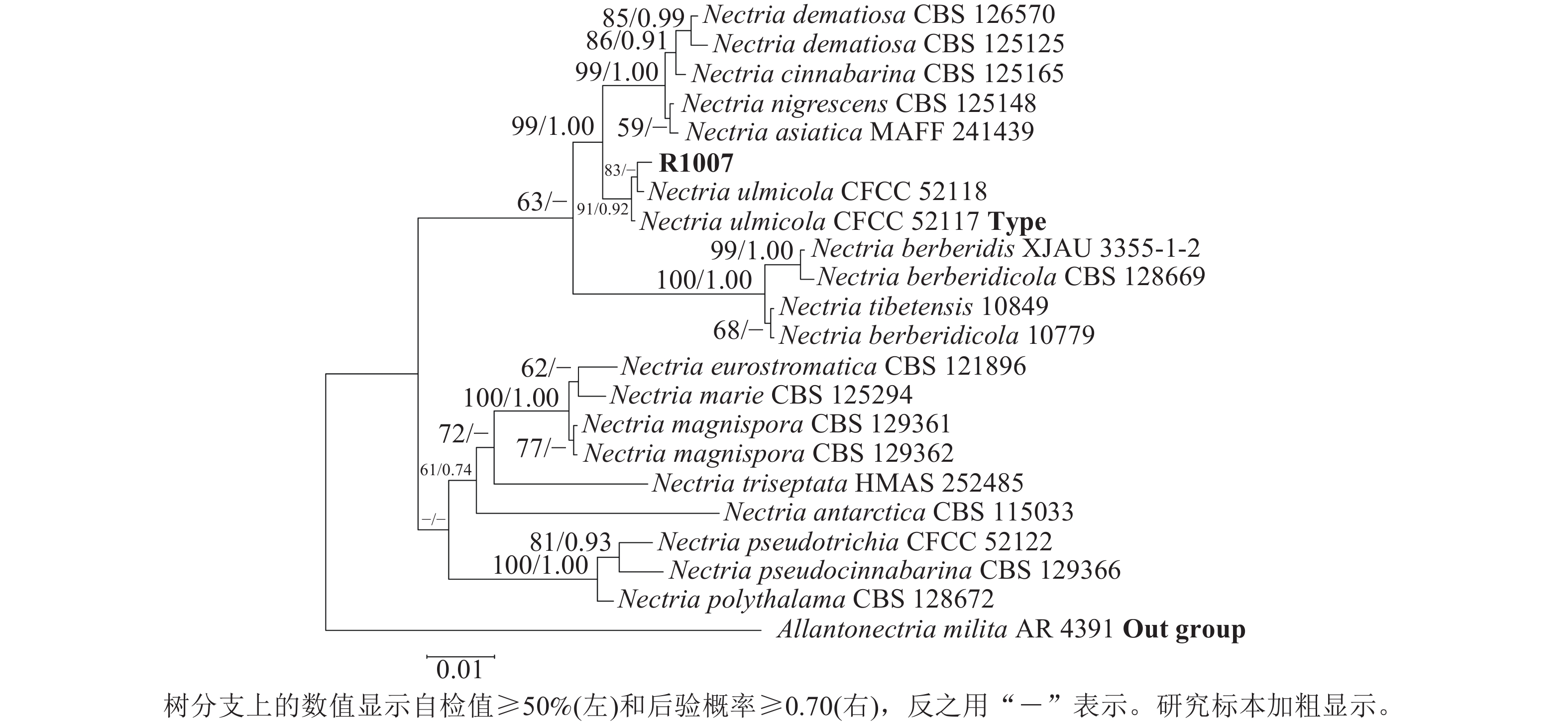 Objective This study aimed to identify the causal pathogen of branch blight in Rosa chinensis, characterize its biological properties, and evaluate effective fungicides to establish a scientific foundation for disease for disease control. Method The pathogen was isolated and purified using tissue isolation. The isolate was characterized morphologically and phylogenetically by multi-locus sequence analysis. Mycelial growth kinetics were assessed under varying carbon/nitrogen sources, pH values, and temperatures using the growth rate method. 5 fungicides were evaluated for inhibitory effects by poisoned medium technique. Result The purified strain R1007 induced disease symptoms upon wound inoculation, and the same strain was re-isolated from infected tissues. Morphological characteristics matched Nectria ulmicola, and Blast analysis with phylogenetic analysis confirmed high genetic similarity to the type strain CFCC52117 of N. ulmicola. Optimal growth conditions were maltose (carbon source), yeast extract (nitrogen source), pH 7.17, and 25 ℃. Among tested fungicides, carbendazim showed the strongest inhibition (EC50=0.338 8 mg·L−1). Conclusion The causal agent of R. chinensis branch blight was identified as N. ulmicola. The optimal growth conditions were maltose and yeast extract as carbon and nitrogen sources, pH 7.17, and 25 ℃. Carbendazim shows promise as an effective fungicide for disease control. [Ch, 5 fig. 2 tab. 28 ref.]