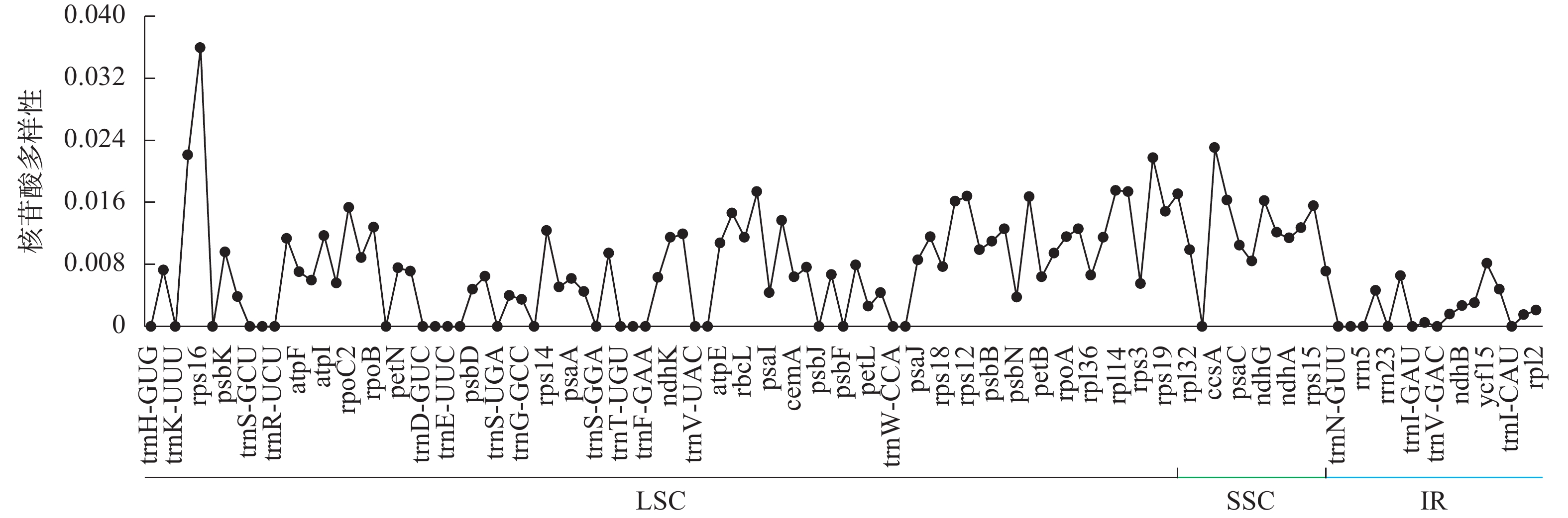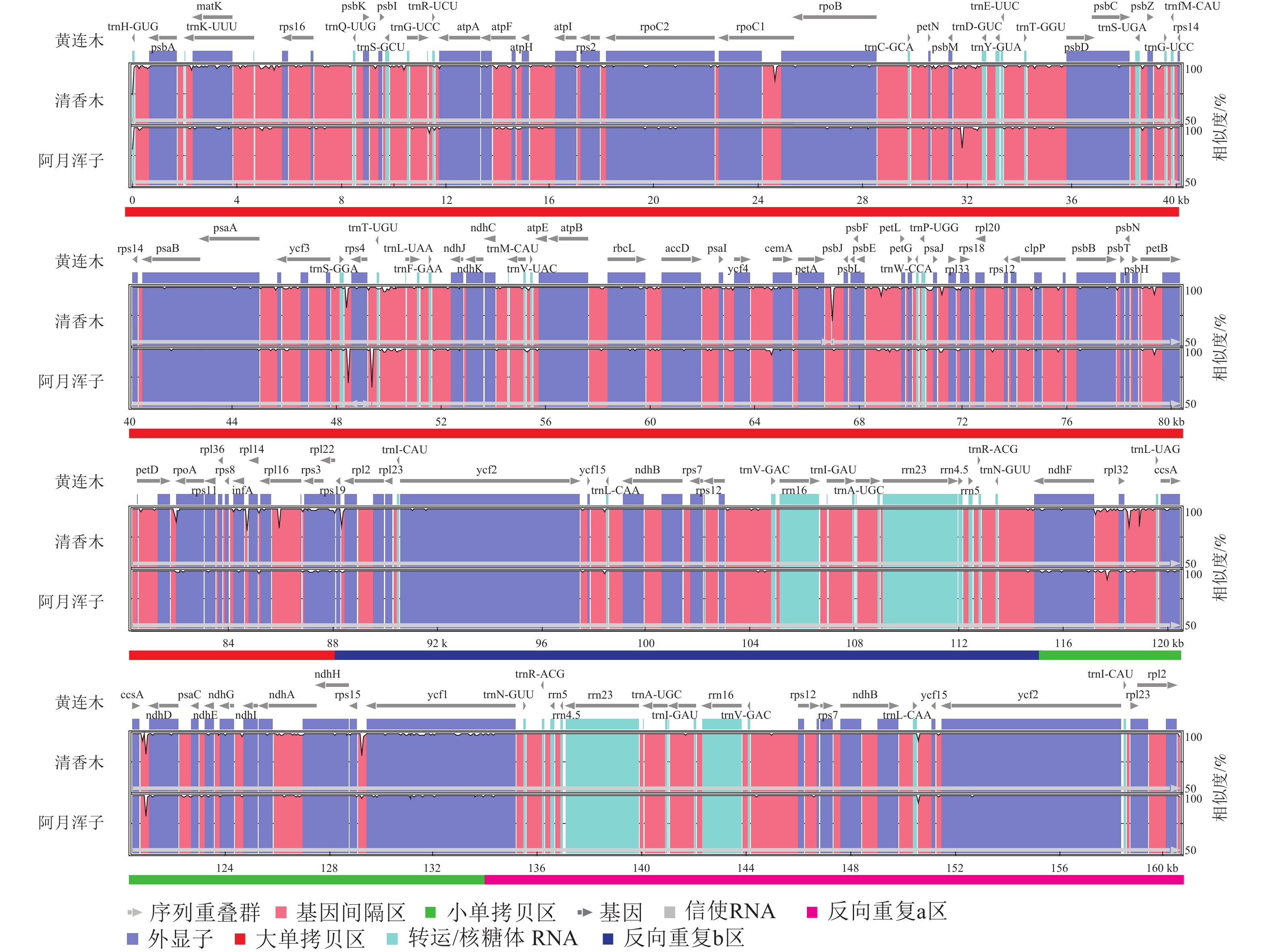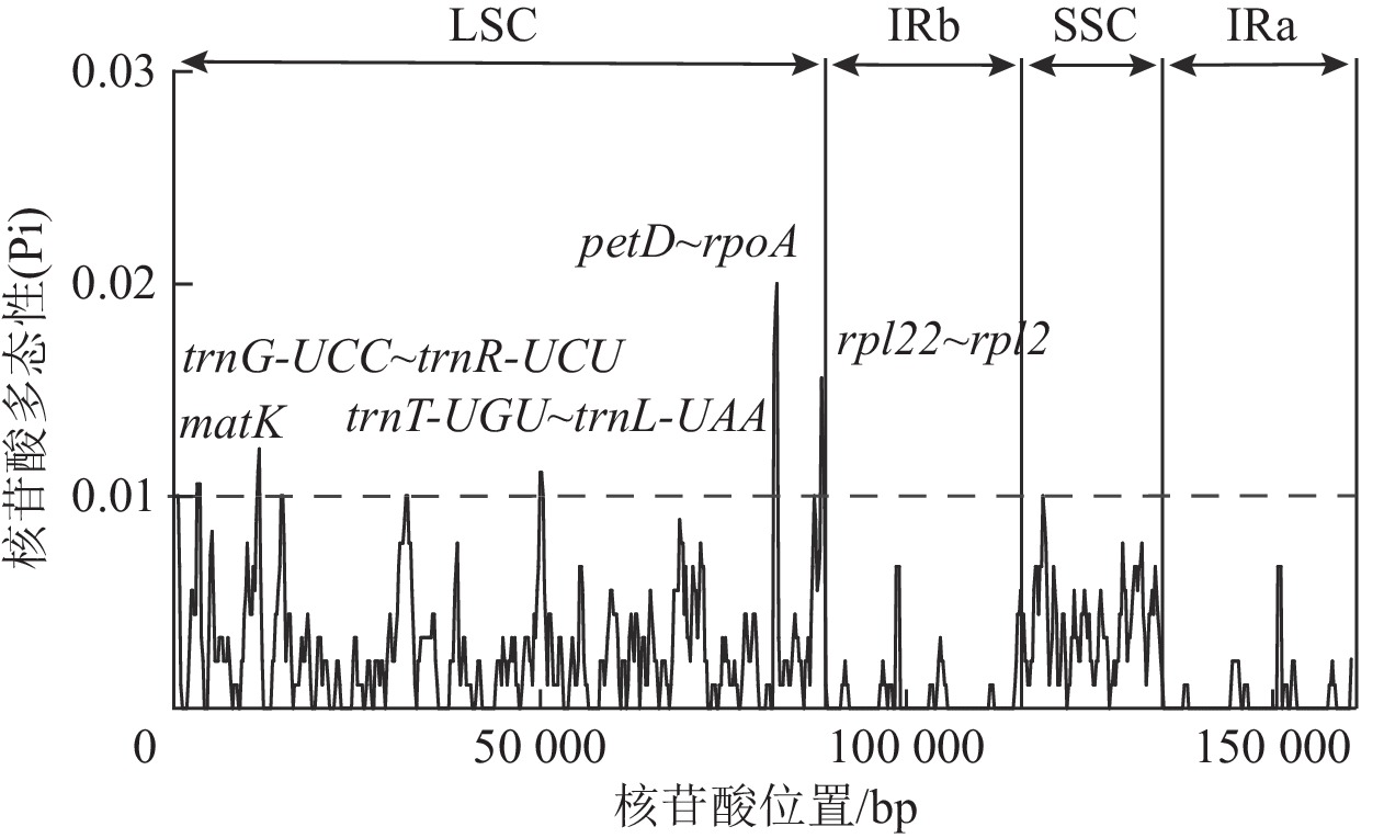 Objective In this study, the chloroplast genomes of 3 Pistacia species were compared to analyze their structural characteristics and genetic evolution. Method 3 publicly available chloroplast genomes of Pistacia species from National Center for Biotechnology Information (NCBI) were selected as research materials, and their chloroplast genome structure, repeat sequence, nucleotide polymorphism and genetic relationship were analyzed by relevant bioinformatics methods. Result The chloroplast genomes of the 3 species were tetrad ring structure, and the numbers of protein-coding sequence (CDS), ribosomal RNA (rRNA), and transfer RNA (tRNA) were exactly the same among them; The simple repeat sequences were mainly A (34.35%) or T (39.69%) repeat units in mono-nucleotide, but no hexa-nucleotide. And the number of scattered repeat sequences were mainly palindromic repeats (105) and forward repeats (76), but no reverse repeats; There were different degrees of variation in the conserved non-coding sequences (CNS) of the large single copy (LSC) and small single copy (SSC) of the chloroplast genomes of three species, but there was no significant difference in the contraction or expansion of genes near the tetrad boundary; 5 highly variable sequences (matK, trnG-UCC~trnR-UCU, trnT-UGU~trnL-UAA, petD~rpoA, rpl22~rpl2) were identified in the LSC region and the boundary between LSC and inverted repeat b (IRb); Phylogenetic reconstruction based on complete chloroplast genomes demonstrated clear segregation between Pistacia and Rhus, and P. chinensis was closely related to P. weinmaniifolia, while P. vera and P. atlantica could be formed a distinct clade. Conclusion The chloroplast genome structure of the 3 Pistacia species was similar and relatively conservative, and the number of various genes was consistent; The 5 mutant sequences detected could be used as candidate molecular markers for Pistacia species; The genetic relationship between P. chinensis and P. weinmannifolia was similar, while P. vera was relatively distant from former 2 species. [Ch, 6 fig. 1 tab. 46 ref.]