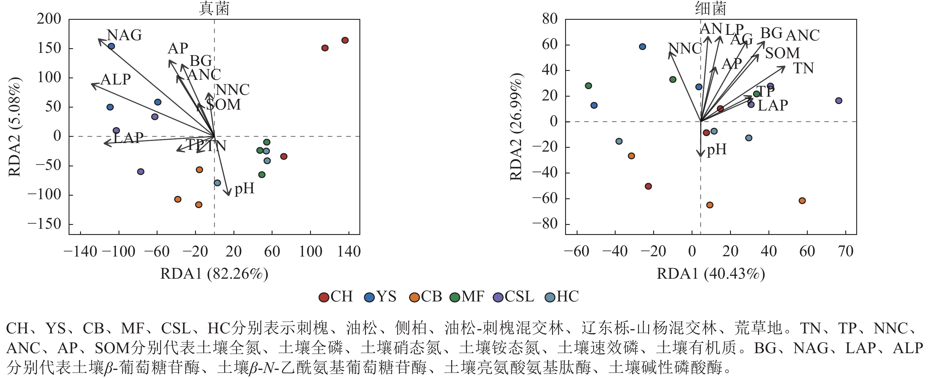 Objective To investigate the effects of different forest stand types on soil nutrients, enzyme activities and microbial diversity, which can provide theoretical basis for the improvement of soil function and the selection of suitable tree species in the study area from the perspective of soil improvement by forest land. Method This study selected 5 typical forest stands (Robinia pseudoacacia pure forest, Pinus tabulaeformis pure forest, Platycladus orientalis pure forest, Pinus tabulaeformis-Robinia pseudoacacia mixed forest, Quercus wutaishanica-Populus davidiana mixed forest) in the loess area of Western Shanxi, and used the barren grassland as the control, to determine the characteristics of soil nutrients, enzyme activities and microbial diversity in different forests, and to analyze the interrelationships among soil nutrients, enzyme activities and microbial diversity by combining the high-throughput sequencing method, one-way analysis of variance, redundancy analysis, etc. This study also analyzed the relationship between soil nutrients, enzyme activities and microbial diversity of different forests. The relationship between soil nutrients, soil enzyme activity and microbial diversity was analyzed by combining high-throughput sequencing and redundancy analysis. Result (1) The soil nutrients of forest land were better than those of barren grassland, and the contents of total nitrogen (TN) and organic matter (SOM) in the Pinus tabulaeformis-R. pseudoacacia and Q. wutaishanica-Populus davidiana mixed forests were significantly higher than those in the other pure forests (P<0.05). (2) Soil β-glucosidase (BG), leucine aminopeptidase (LAP), and alkaline phosphatase (ALP) activities were the highest in Q. wutaishanica-Populus davidiana mixed forests, and soil β-N-acetylamino-glucosidase (NAG) activity was the highest in Pinus tabulaeformis pure forest. (3) ACE, Chao1 and Shannon’s alpha diversity indices of soil bacteria were generally high, but mixed forest creation significantly enhanced the species richness of fungal communities (P<0.05). (4) Soil enzyme activities were significantly correlated with soil TN, ANC, NNC, AP and SOM contents (P<0.05), and soil microbial diversity was were closely correlated (P<0.05). Soil NAG and ANC were the key drivers of microbial communities. Conclusion The comprehensive study showed that mixed forests exhibited significant positive effects on soil nutrient accumulation, enhanced enzyme activities and increased fungal diversity compared with pure forests and barren grasslands. Therefore, based on the perspective of soil improvement by forest stands, it is recommended that a mixed forest configuration with deciduous broadleaf or coniferous broadleaf species as the core should be prioritized in the vegetation restoration and reconstruction of loess area. [Ch, 4 fig. 6 tab. 32 ref.]