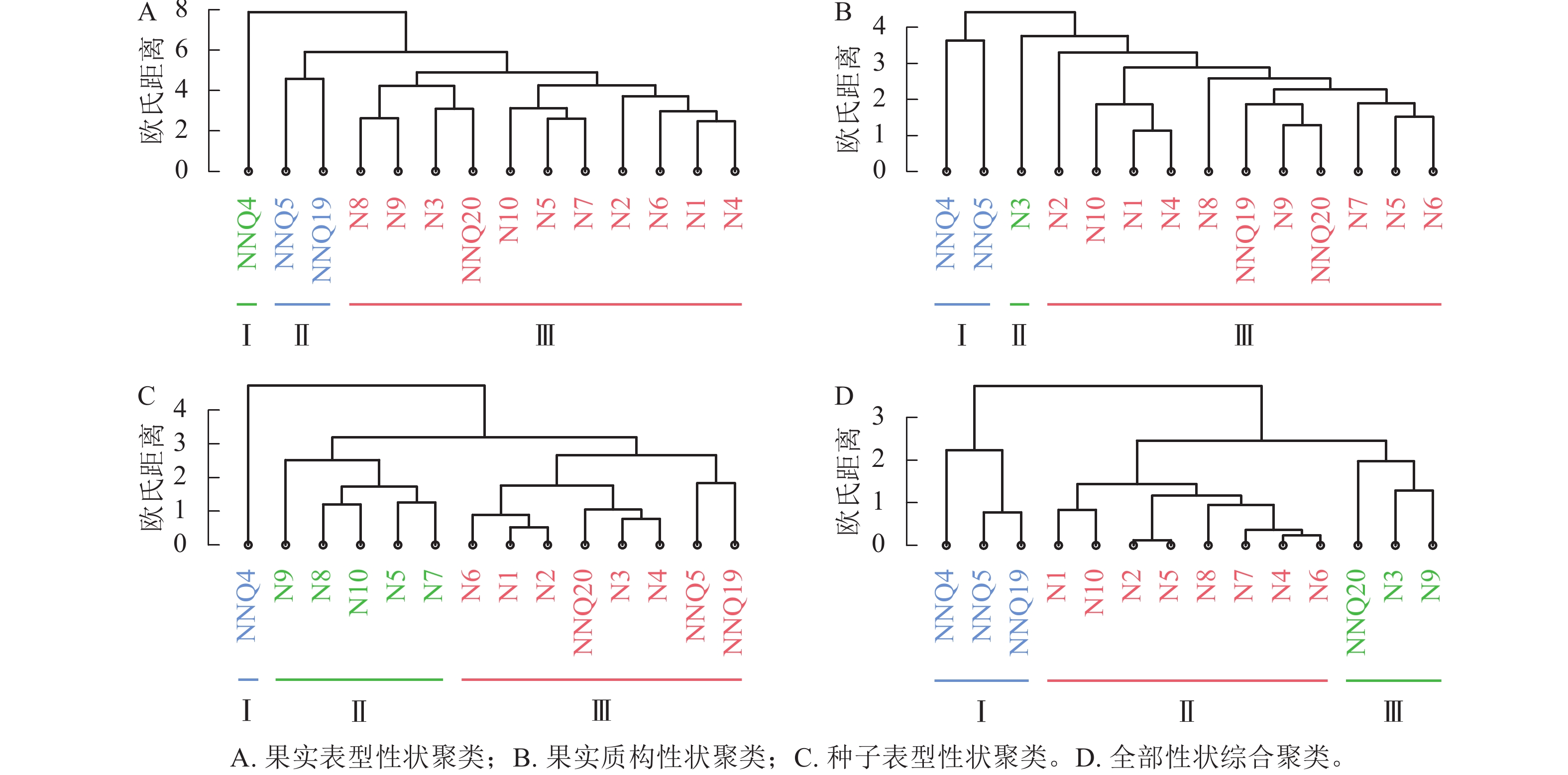 Objective The aim of this study is to determine and analyze the traits and study the variation pattern of seed and fruit traits of different cultivars of Lycium barbarum so as to provide theoretical basis for cultivating good varieties and utilizing germplasm resources. Method 14 L. barbarum cultivars (10 red fruits and 4 yellow fruits) collected from a germplasm repository were selected as research materials. Their seed and fruit traits were measured, followed by correlation analysis, coefficient of variation (CV) analysis, cluster analysis, principal component analysis (PCA), and comprehensive evaluation. Result (1) Significant positive correlation between seed and fruit size and length of fruit stalk of L. barbarum (P<0.05). (2) The CV of phenotypic traits among cultivars ranged from 0.17% to 59.08%, with an average CV of 19.16%, indicating high phenotypic diversity. Significant differences were observed both within and between varieties (P<0.05). Fruit traits exhibited greater variability (CV=9.69%) compared to seed traits (CV=17.17%). (3) ‘Ningnongqi 20’ was clustered into one class with red fruit L. barbarum under different dimensional clustering, and its variation pattern of seed and fruit traits was more similar to that of red fruit L. barbarum. ‘Ningnongqi 4’ formed an independent cluster (Group Ⅰ) in all analyses, demonstrating unique trait variations. (4) PCA identified 4 principal components with a cumulative contribution rate of 74.478%, capturing most genetic information. Key traits influencing component loadings included adhesiveness, gumminess, chewiness, fruit length/width, fruit shape index, seed length/width, and thousand-seed weight. (5) Comprehensive evaluation ranked ‘Ningnongqi 4’ first, followed by ‘Ningqi 3’ ‘Ningnongqi 20’, and ‘Ningqi 9’. Conclusion The 14 L. barbarum cultivars exhibited substantial phenotypic diversity in seed and fruit traits, providing valuable breeding materials. ‘Ningnongqi 4’ with the highest comprehensive score, showed superior textural properties, its high hardness may facilitate mechanical harvesting, while low elasticity necessitates adjusted processing parameters. [Ch, 3 fig. 7 tab. 40 ref.]