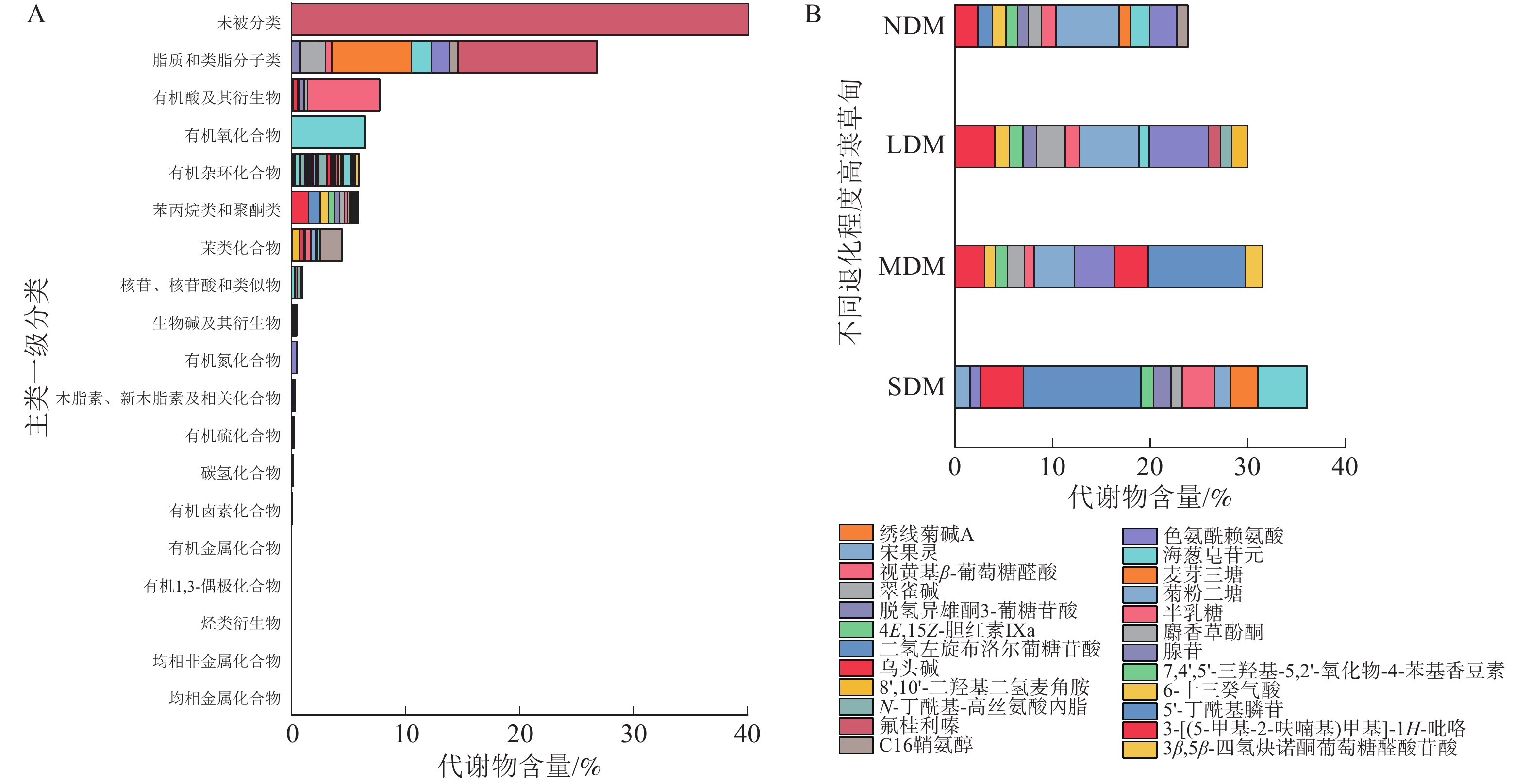 Objective This study examines soil metabolite variations in degraded alpine meadows of the Sanjiangyuan region, identifies key metabolic pathway shifts, and assesses their correlations with soil environmental factors. The findings provide scientific insights into degradation drivers and soil ecological responses. Method This study focuses on alpine meadows in Sanjiangyuan National Park, Maqin County, Guoluo Tibetan Autonomous Prefecture, Qinghai Province. It uses untargeted LC-MS/MS metabolomics to analyze soil metabolites across a degradation gradient, including non-degraded, lightly degraded, moderately degraded, and severely degraded meadows. The study also examines correlations between key differentially expressed metabolites and soil environmental factors. Result A total of 8 451 metabolites were identified, with lipids and lipid-like molecules being the most abundant (26.81%). Soil degradation significantly altered metabolite types and contents, with the most significant differences observed between heavily degraded and other meadow types. The top 20 signature metabolites included carboxylic acids, fatty acyls, organic nitrogen compounds, and sphingolipids. Key metabolic pathways affected were linoleic acid metabolism, ABC transporters, phospholipase D signaling, and sphingolipid signaling. Redundancy analysis revealed significant correlations between soil metabolites and environmental factors such as organic matter, water content, total nitrogen, total phosphorus, pH, and urease activity. Conclusion The types of signature metabolites, differentially expressed metabolites, and major metabolic pathways in alpine meadow soils varied significantly across degradation levels. These variations were hypothesized to correlate strongly with changes in environmental factors such as soil organic matter, water content, total nitrogen, total phosphorus, pH, and soil urease. [Ch, 6 fig. 2 tab. 55 ref.]