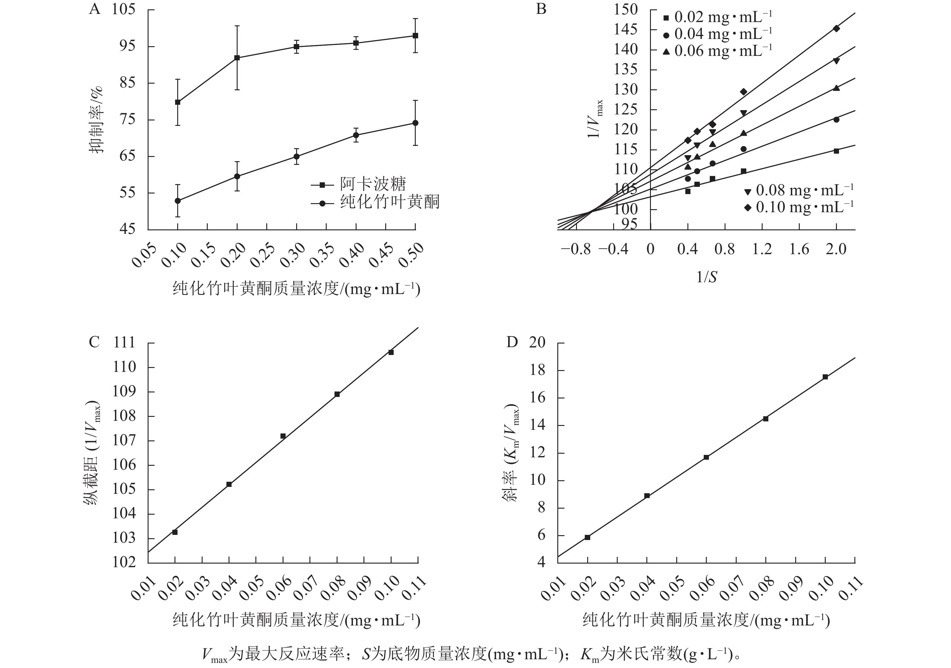 Objective This study aimed to identify the flavonoid components in the leaves of Neosinocalamus affinis and to investigate their inhibitory effects on α-glucosidase and α-amylase, so as to provide a theoretical basis for the deep utilization and development of N. affinis leaf resources. Method Using N. affinis leaves as raw material, purified bamboo leaf flavonoids (PBLF) were obtained by macroporous resin purification. The chemical components of PBLF were identified by ultra-performance liquid chromatography-mass spectrometry (UPLC-MS). The inhibitory effects of PBLF on α-amylase and α-glucosidase activities, as well as the hypoglycemic mechanism of PBLF, were investigated through in vitro experiments. Result 18 flavonoid compounds were identified in the N. affinis leaf extract, including glycyrrhizinol, epimedium cyanidin Ⅱ, and baohuoside Ⅰ. Furthermore, the in vitro results demonstrated that PBLF significantly inhibited both α-amylase and α-glucosidase activities. At a concentration of 0.5 mg·mL−1, PBLF inhibited α-amylase by 79.71%±5.02% with a half-maximal inhibitory concentration (IC50) of (0.057±0.005) mg·mL−1, and inhibited α-glucosidase by 74.17%±6.17% with an IC50 of (0.071±0.004) mg·mL−1, and both types of enzyme inhibition showed competitive-noncompetitive mixed inhibition. Conclusion Enzyme inhibition kinetic studies indicated that the flavonoids present in N. affinis leaves likely function as active hypoglycemic components, potentially through a non-competitive inhibition mechanism. [Ch, 3 fig. 4 tab. 34 ref.]