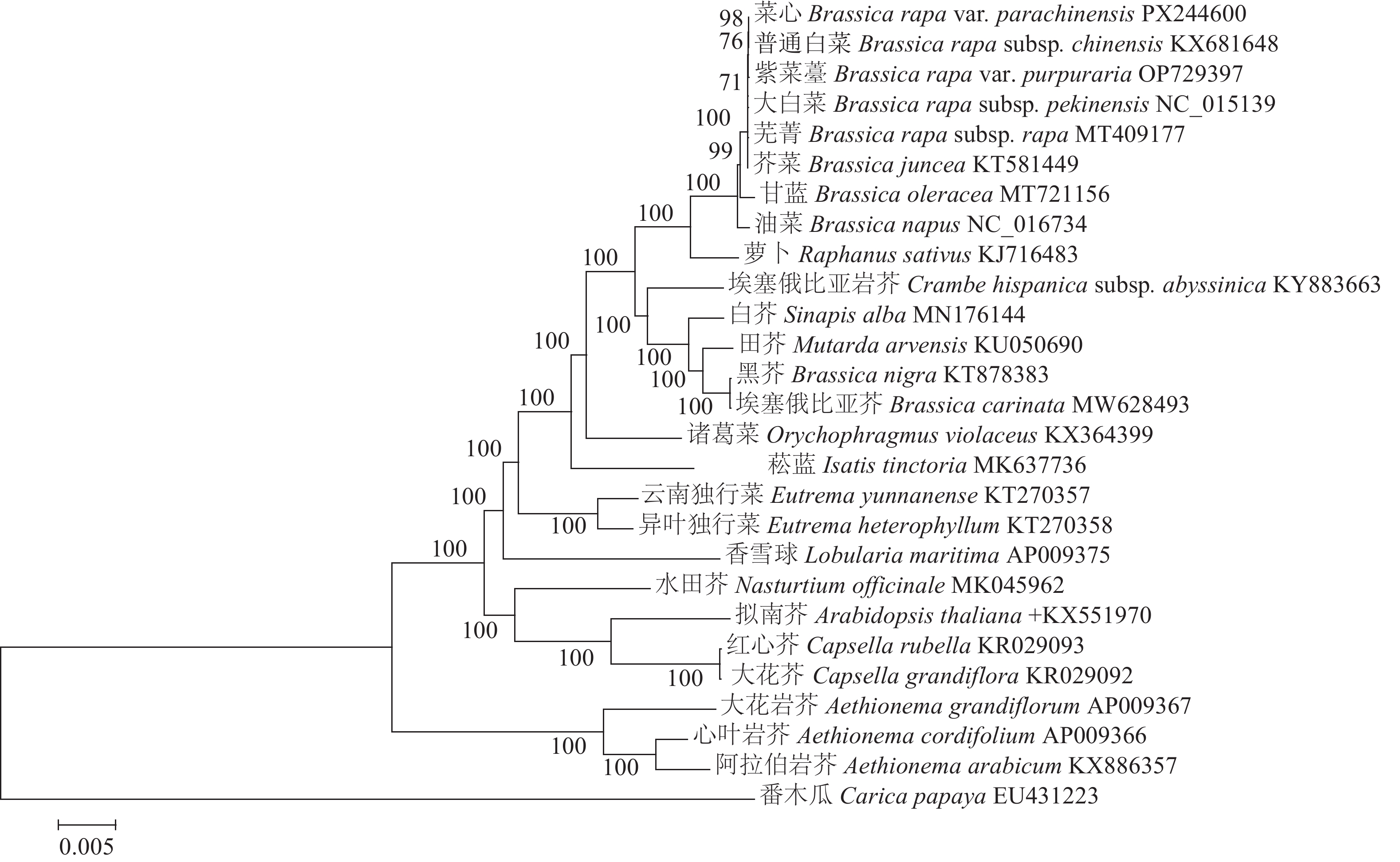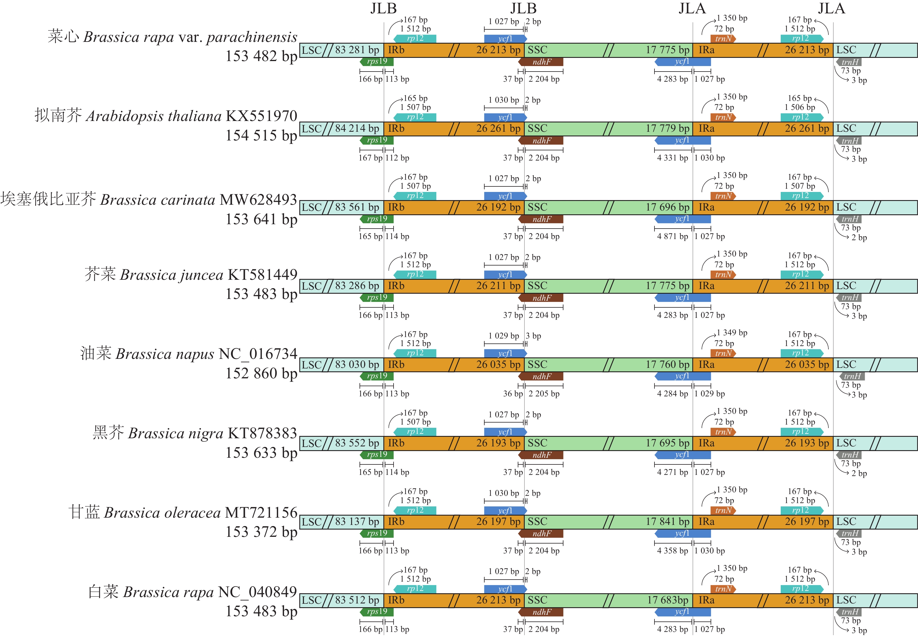 Objective This study aims to assemble, annotate, and analyze the chloroplast genome of flowering Chinese cabbage (Brassica rapa var. parachinensis), and to elucidate its phylogenetic relationships with other Brassicaceae crops. Method The complete chloroplast genome of flowering Chinese cabbage was sequenced using the Illumina NovaSeq 6000 platform. Bioinformatics approaches were employed to analyze its genome structure, repetitive sequences, nucleotide diversity, codon usage bias, and phylogenetic relationships by constructing phylogenetic trees with chloroplast genome sequences of other 25 Brassicaceae species. Result The chloroplast genome of flowering Chinese cabbage is 153 482 bp in length with a GC content of 36.36%, exhibiting a typical quadripartite structure. In total, 132 functional genes had been identified and annotated, comprising 86 protein-coding genes, 37 tRNA genes, 8 rRNA genes, and 1 pseudogene. Codon usage bias analysis revealed that leucine (Leu) is the most frequently used amino acid, with 31 codons showing a relative synonymous codon usage (RSCU) value greater than 1, predominantly ending with A or U. Repetitive sequence analysis detected 37 dispersed repeats and 315 simple sequence repeats (SSRs), with mononucleotide repeats predominating (72.70% of total SSRs). The nucleotide diversity of small single copy region (SSC) is the highest, while that of inverted repeat region (IR) is the lowest. Phylogenetic analysis revealed that flowering Chinese cabbage exhibits the closest genetic relationship with leafy Chinese cabbage varieties. Conclusion The chloroplast genome of flowering Chinese cabbage exhibits a conserved quadripartite structure and demonstrates close phylogenetic relationships with B. rapa var. chinensis, B. rapa var. purpuraria, and B. rapa subsp. pekinensis. [Ch, 5 fig. 3 tab. 39 ref.]