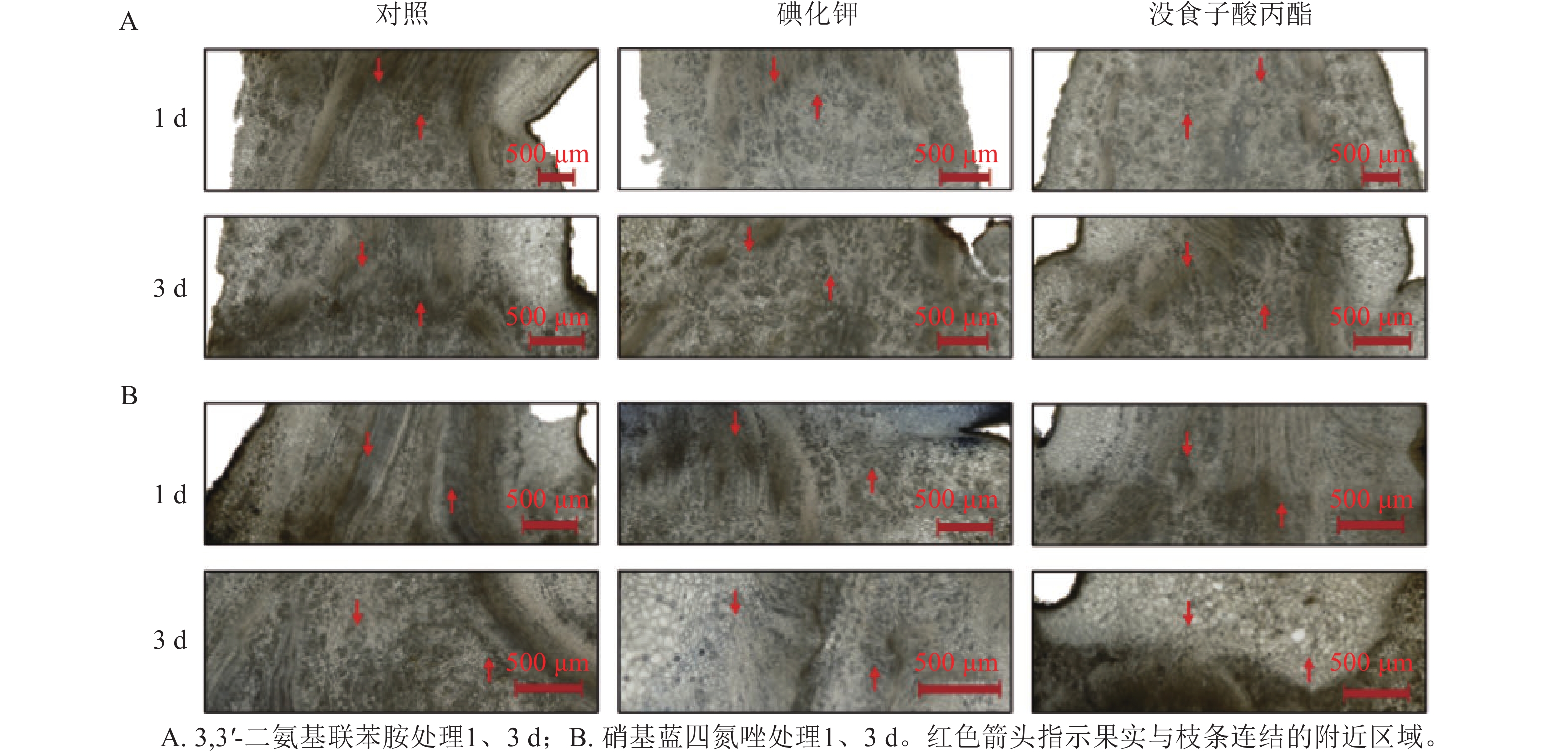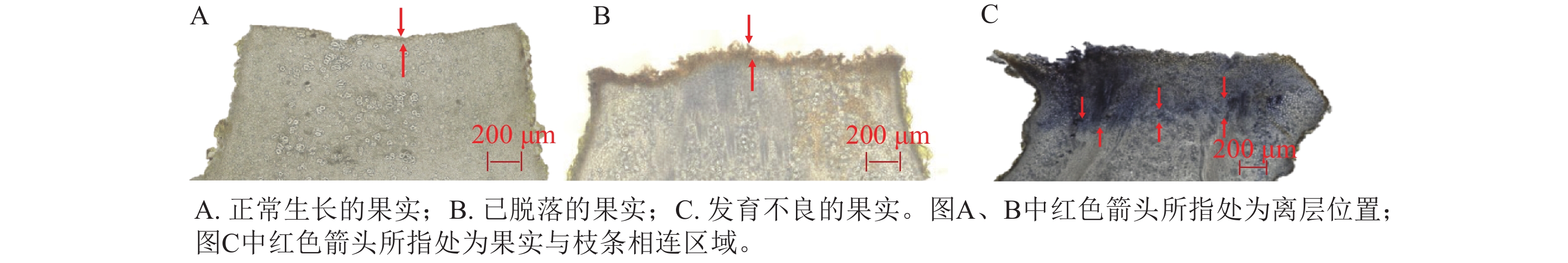 Objective Carya cathayensis is important economic tree species in China, suffers from severe fruit abscission, which significantly affects yield and economic benefits. This study aims to reveal the fruit abscission characteristics of C. cathayensis and explore the regulatory effects of 2 reactive oxygen species (ROS) scavengers (potassium iodide and propyl gallate) on fruit abscission. Method C. cathayensis from Chun’an and Lin’an in Zhejiang were used as research subjects. Solutions of potassium iodide (KI) and propyl gallate (PG) at different concentrations were sprayed in 2023 and 2024, water spray served as the control, and the fruit abscission rate was calculated, KI concentrations were 3.0, 5.0, and 10.0 mmol·L−1; PG concentrations were 0.1, 0.3, and 0.5 mmol·L−1, all confidence intervals for mean differences were calculated at the 95% confidence level. The ROS content in fruit tissues was detected by 3,3'-diaminobenzidine (DAB) and nitroblue tetrazolium (NBT) staining methods to analyze the dynamic changes of ROS during fruit abscission. Result A large amount of physiological fruit abscission occurred in C. cathayensis from April to June, with natural abscission rates reaching 89.55%±2.43% in 2023 and 80.09%±4.05% in 2024. There were 2 types of fruit abscission: the fruit directly separated from the branch or the fruit separated from the branch together with the pedicel. After treatment with ROS scavengers, the fruit abscission rates were 57.24%±8.60% (2023) and 61.22%±2.75% (2024) for the 3 mmol·L−1 KI treatment group, and 51.85%±3.15% (2023) and 45.77%±2.17% (2024) for the 0.5 mmol·L−1 PG treatment group. Histological analysis showed that the ROS levels in the abscission zone significantly increased before abscission, while KI and PG treatments effectively reduced ROS accumulation in fruit tissues. Conclusion Fruit abscission in C. cathayensis occurring predominantly from April to June. ROS play a key role in the formation of the abscission layer, and 3 mmol·L−1 KI and 0.5 mmol·L−1 PG significantly reduced the fruit abscission rate by scavenging ROS. [Ch, 4 fig. 1 tab. 27 ref.]