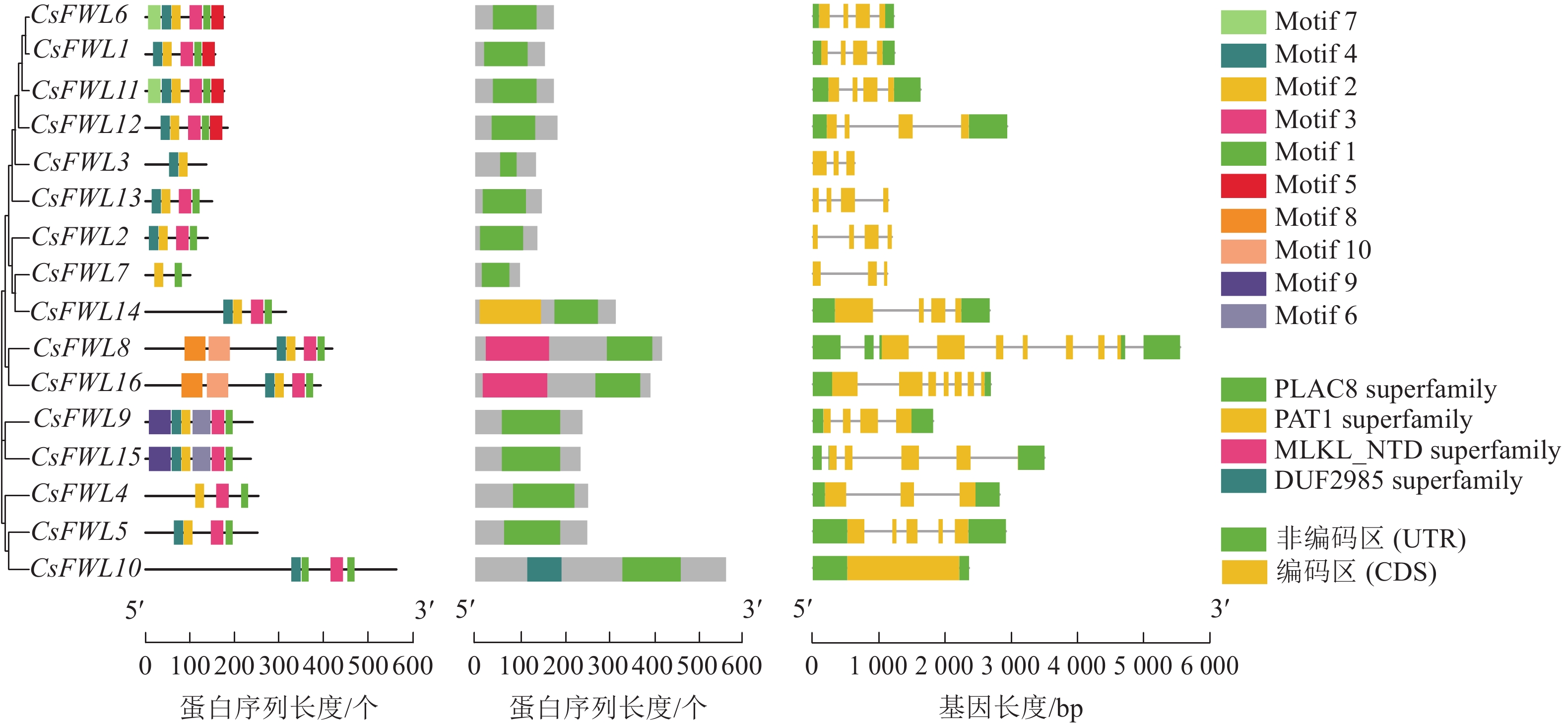 Objective This study aims to identify the members of the FW2.2 family in Citrus sinensis and analyze their structural characteristics and expression patterns during the fruit cell division period, so as to provide a theoretical basis for exploring the function of the FW2.2 gene family in C. sinensis fruit development. Method Based on the whole genome data of C. sinensis, FW2.2 family members were screened and identified. Bioinformatics methods were employed to predict and analyze their gene structure, sequence characteristics, chromosome localization, and cis-acting elements. A phylogenetic tree was constructed with FW2.2 sequences from multiple species. The expression patterns of FW2.2 family members during the fruit cell division period were analyzed by real-time fluorescence quantitative polymerase chain reaction (RT-qPCR) technology. Result A total of 16 FW2.2 genes were identified in C. sinensis, distributed on 6 chromosomes, with a length of 100 to 563 amino acids, containing multiple conserved motifs, and mainly located in the cell membrane. Evolutionary analysis revealed that FW2.2 family members from C. sinensis, Solanum lycopersicum, Pyrus bretschneideri, Prunus persica, Zea mays and Oryza sativa were divided into 6 subgroups. Cis-acting elements analysis showed that the promoters of FW2.2 family genes contained elements related to the hormone, growth and development, and abiotic stress. Gene expression analysis showed that there were differences in the expression trends of FW2.2 family genes during the fruit cell division period. The expression levels of CsFWL5, CsFWL6 and CsFWL12 decreased significantly during the fruit cell division period, and were negatively correlated with the increase in cell layers (P<0.01). Conclusion CsFWLs members exhibit a certain degree of conservation during evolution, and share sequence similarities with FWLs genes in crops such as Pyrus bretschneideri, Prunus persica, and S. lycopersicum. CsFWLs show different gene functions. CsFWL5, CsFWL6 and CsFWL12 may be involved in regulating fruit cell division. [Ch, 6 fig. 3 tab. 33 ref.]