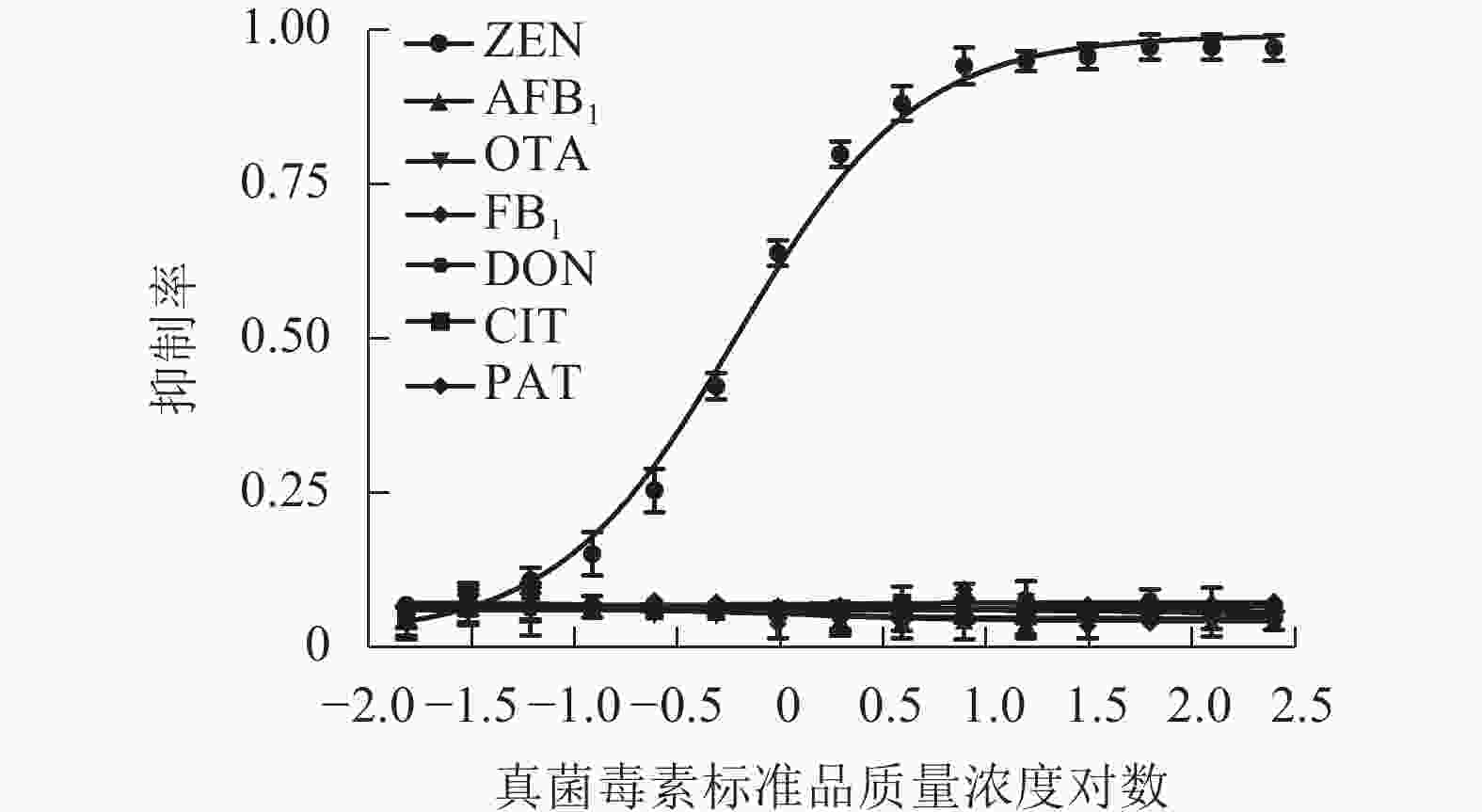 分别将ZEN、黄曲霉毒素B1 (AFB1)、赭曲霉毒素A (OTA)、伏马毒素(FB1)、呕吐毒素(DON)、桔青霉毒素(CIT)和展青霉毒素(PAT)作为竞争抗原,通过配制成梯度质量浓度的标准品溶液,作为竞争抗原,绘制标准抑制曲线并获得IC50,按照下列公式计算交叉反应率,确定该方法的特异性[23]。交叉反应率=(AZEN)/(A类似物)×100%。其中:AZEN为ZEN的IC50,A类似物为类似物的IC50。