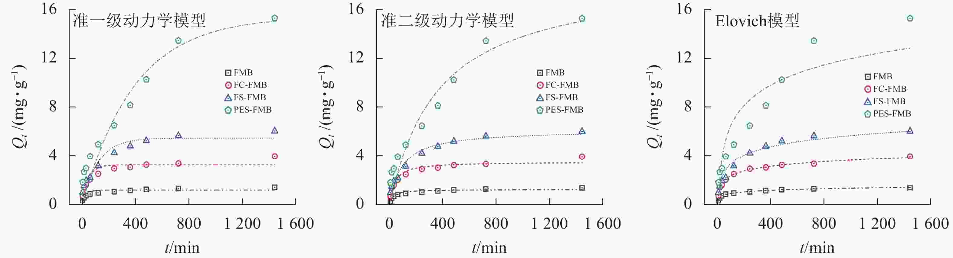 Elovich模型被广泛应用于描述水溶液污染物的吸附过程,该模型的假设是吸附剂表面具有高度的不均匀性。其方程式为:$ {Q}_{t}=\alpha +\beta \mathit{{\mathrm{ln}}}t $。其中,$ \alpha $为初始Elovich吸附速率(mg·mg−1·min−1);$ \beta $为与化学吸收活化能和表面覆盖率有关的Elovich解吸常数(g·mg−1)。