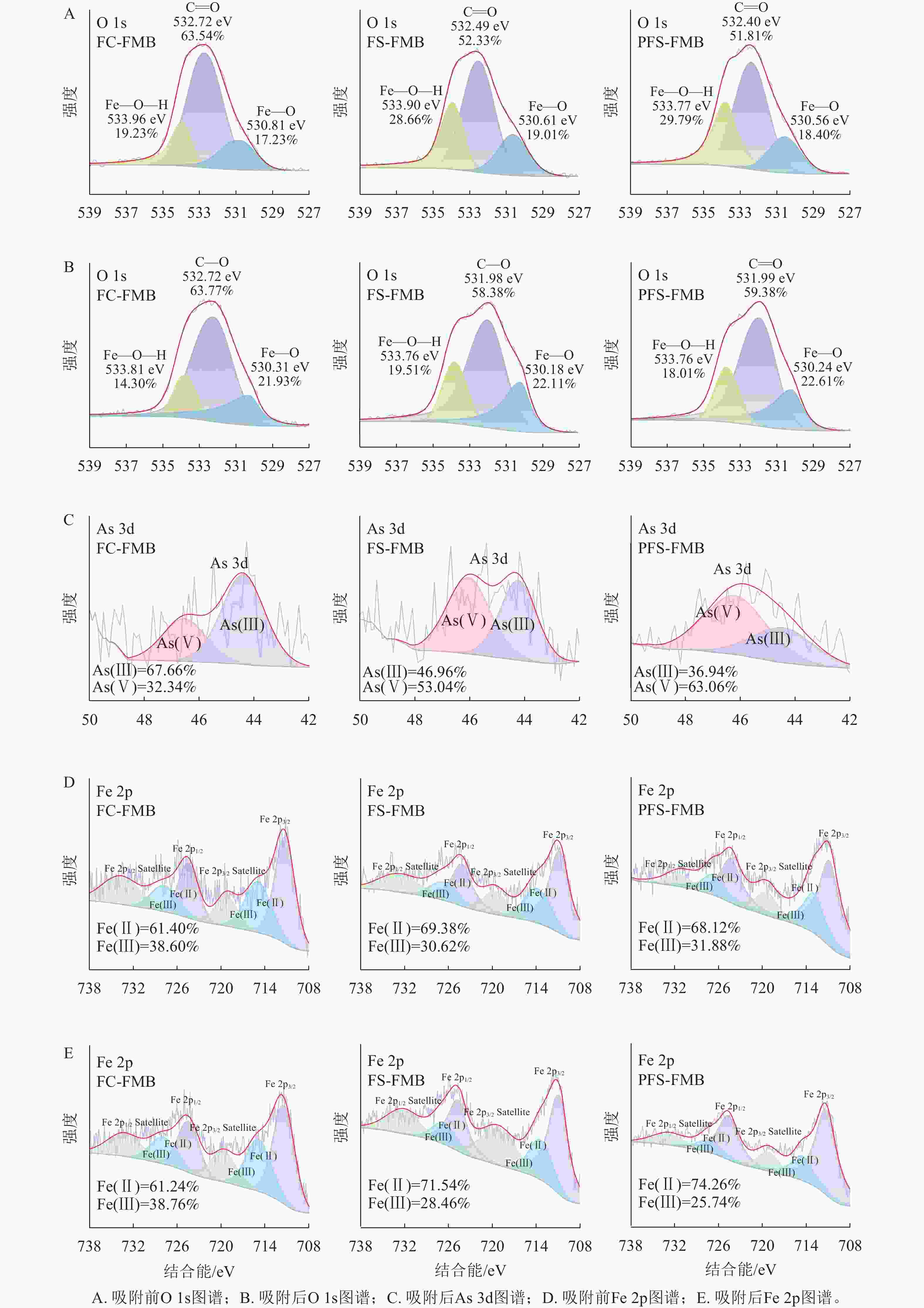 综上所述,生物质炭吸附后,2个配体原子同时与2个中心金属离子形成配位键,结合FTIR分析中内层络合物的形成,推断As(Ⅲ)与生物质炭之间的结合主要通过双齿双核内球络合机制实现[45]。PFS-FMB的Fe—O—H结构比例最高,其次是FS-FMB,FC-FMB最低(图9A)。由于Fe—O—H结构在As的吸附过程中发挥重要作用,其比例的差异直接影响了改性生物质炭对As(Ⅲ)的吸附能力。这与PFS-FMB对As(Ⅲ)的吸附量最大,而FC-FMB的吸附量在三者中最低的实验结果一致。