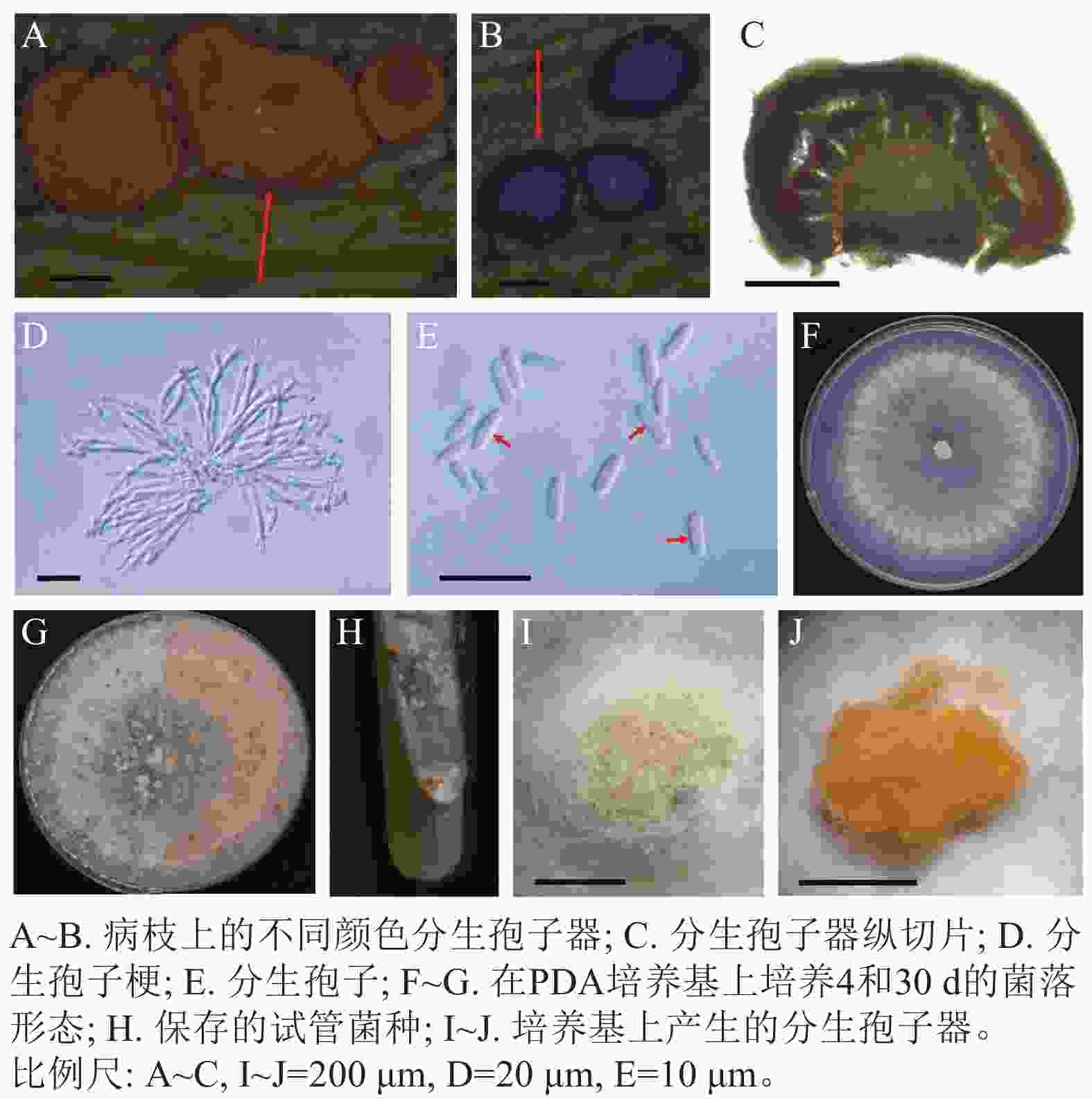 病原菌分生孢子器半埋生于寄主树枝表皮下,近圆形至不规则形,橙红色,老后转变为黑色,直径为240~630 μm (n=30),表面光滑,单生,内部脑状(图2A~C)。分生孢子梗无色透明,顶端具有小梗,不分叉(图2D)。分生孢子大小为(4.75~7.25) μm× (1.25~2.25) μm,平均为5.5 μm×2.0 μm (n=50),单孢,椭圆形,部分稍微弯曲,无隔(图2E)。未发现有性型。菌落在PDA培养基上呈辐射状生长,绒毛状,最初为纯白色,后期稍显污白色,质地均匀,边缘波浪状或平整,25 ℃全黑暗培养条件下最快6 d可以长满PDA培养基,之后经光照刺激,14 d 即可产生橙色的分生孢子器,菌落背面逐渐产生橙红色色素(图2F~J)。