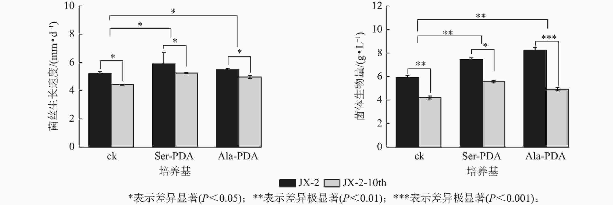 将菌株JX-2分别在PDA(ck)、Ser-PDA、Ala-PDA中继代培养10代,获得多次传代菌株JX-2-10th,比对JX-2与JX-2-10th的生长速度、生物量,结果如图1所示。在PDA中继代培养10代菌株后,菌丝生长速度、生物量显著下降(P<0.05),分别降低了15.45%、28.67%。在添加Ser、Ala的培养基中进行继代培养的JX-2-10th菌株的菌丝生长速度和生物量较JX-2虽有所降低,但优于ck,菌丝生长速度分别提高7.14%、4.76%,生物量提高37.50%、22.50%,均达到差异显著水平(P<0.05)。上述结果表明多次传代后秀珍菇菌株的菌丝体生理指标出现退化特征,但Ser、Ala的添加,能够一定程度上减缓菌株传代过程中的退化现象。