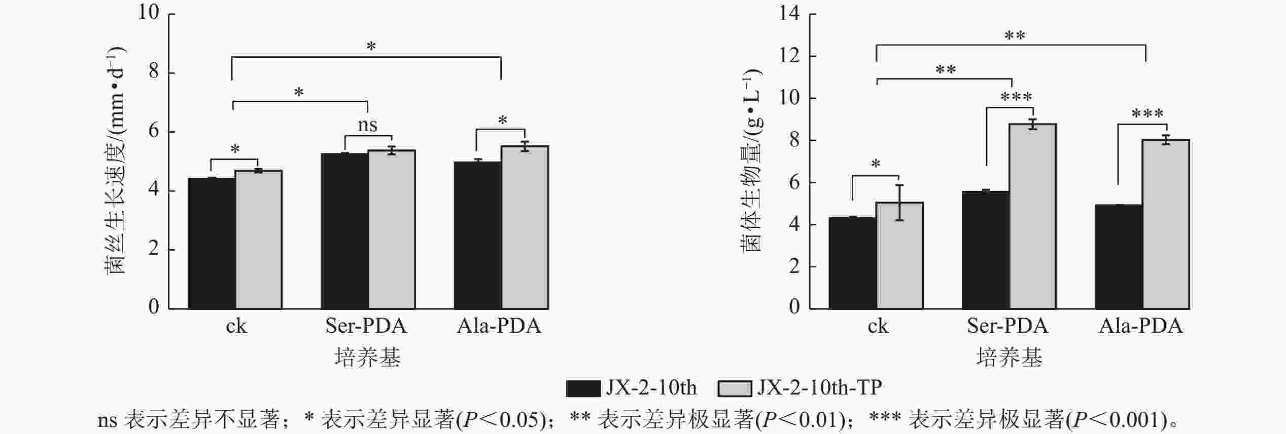 对照组为马铃薯葡萄糖琼脂培养基(PDA,ck),处理组培养基为Ser-PDA、Ala-PDA,参考陈长兰等[13]的方法,Ser与Ala添加量为2 g·L−1。