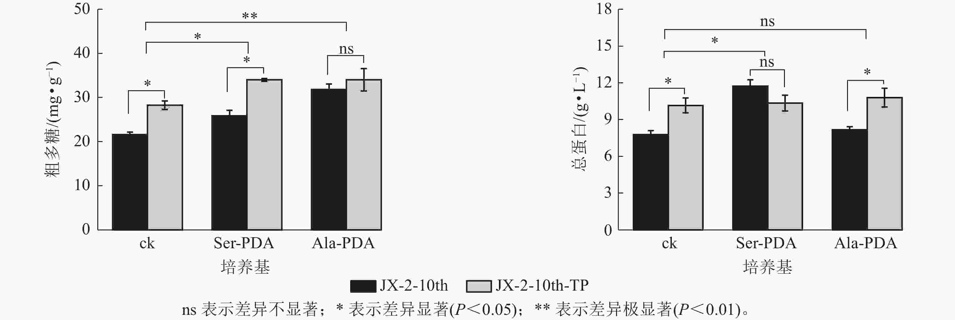 如图3所示:在PDA培养基(ck)中,复壮后菌株JX-2-10th-TP菌丝粗多糖质量分数比复壮前菌株JX-2-10th提高30.66% (P<0.05);在Ser+PDA培养基中,JX-2-10th-TP菌丝的粗多糖质量分数较复壮前提高31.52%(P<0.05);在Ala+PDA培养基中,复壮后菌丝的粗多糖质量分数虽然有所提升,但未达到显著水平。表明尖端纯化有助于改善退化秀珍菇菌株粗多糖质量分数降低的现象,且Ser能够促进尖端纯化效果,有效提高秀珍菇菌株中粗多糖。