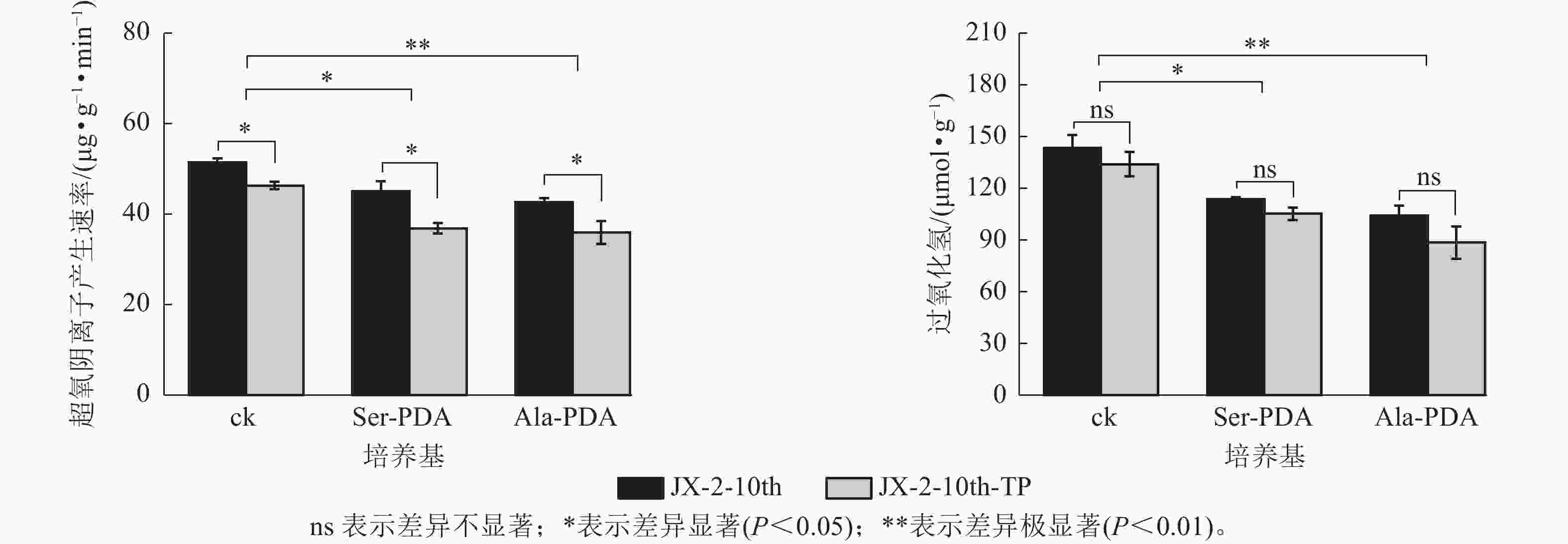 如图4所示:在PDA培养基(ck)中,JX-2-10th-TP的菌丝的超氧阴离子产生速率降低了9.90%,显著低于纯化前(P<0.05)。菌丝的H2O2质量摩尔浓度较JX-2-10th降低了6.51%;在Ser-PDA或Ala-PDA培养基中JX-2-10th-TP菌丝的超氧阴离子产生速率较JX-2-10th均显著降低(P<0.05),分别降低18.26%、15.80%。H2O2质量摩尔浓度较JX-2-10th分别降低7.56%、14.89%。说明尖端纯化能够有效改善退化秀珍菇菌株中超氧阴离子和H2O2的积累,且Ser、Ala处理后效果更佳。