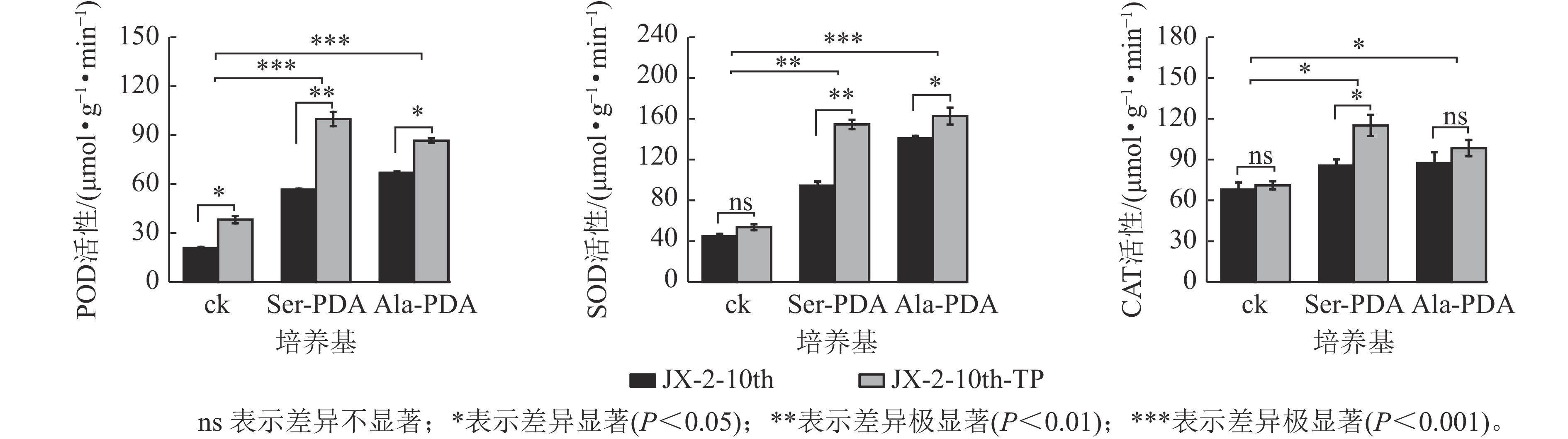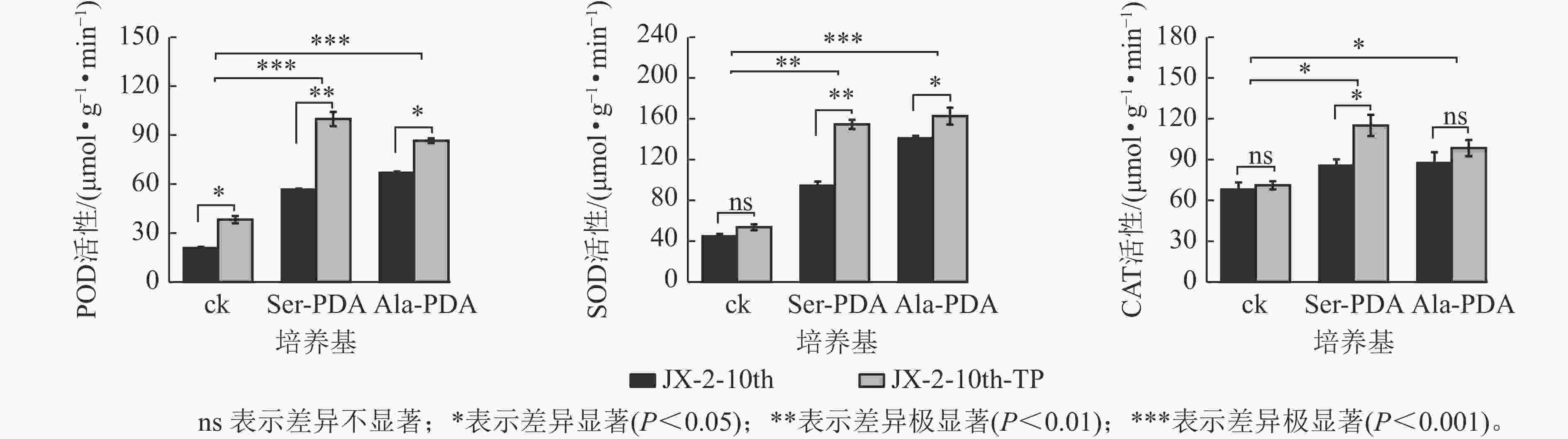如图5所示:POD通过催化机体内过氧化氢发生氧化还原反应,清除体内H2O2。JX-2-10th-TP在PDA (ck)、Ser-PDA和Ala-PDA中培养的菌丝的POD活性均显著提高(P<0.05),分别比纯化前提高了84.20%、78.09%、29.41%。SOD主要通过催化超氧阴离子发生歧化反应,清除机体内积累的超氧阴离子。JX-2-10th-TP在ck的菌丝SOD活性较JX-2-10th提高了20.07%,在PDA+ Ser和PDA+Ala的培养基中,JX-2-10th-TP的SOD活性均显著提高(P<0.05),分别提高了63.70%、15.41%。CAT是主要承担机体内过氧化氢的分解,抑制过氧化氢堆积。JX-2-10th-TP在ck中培养的菌丝的CAT活性较JX-2-10th有所提高;在Ser-PDA培养基中,JX-2-10th-TP的SOD活性显著提高(P<0.05),比JX-2-10th提高34.56%;而在Ala-PDA培养基中,JX-2-10th-TP的SOD活性较JX-2-10th提高了12.56%,但未达显著差异。由上可知,尖端纯化能有效恢复退化秀珍菇菌株的抗氧化酶POD、SOD和CAT活性,且在Ser-PDA或Ala-PDA培养基中恢复效果更佳。