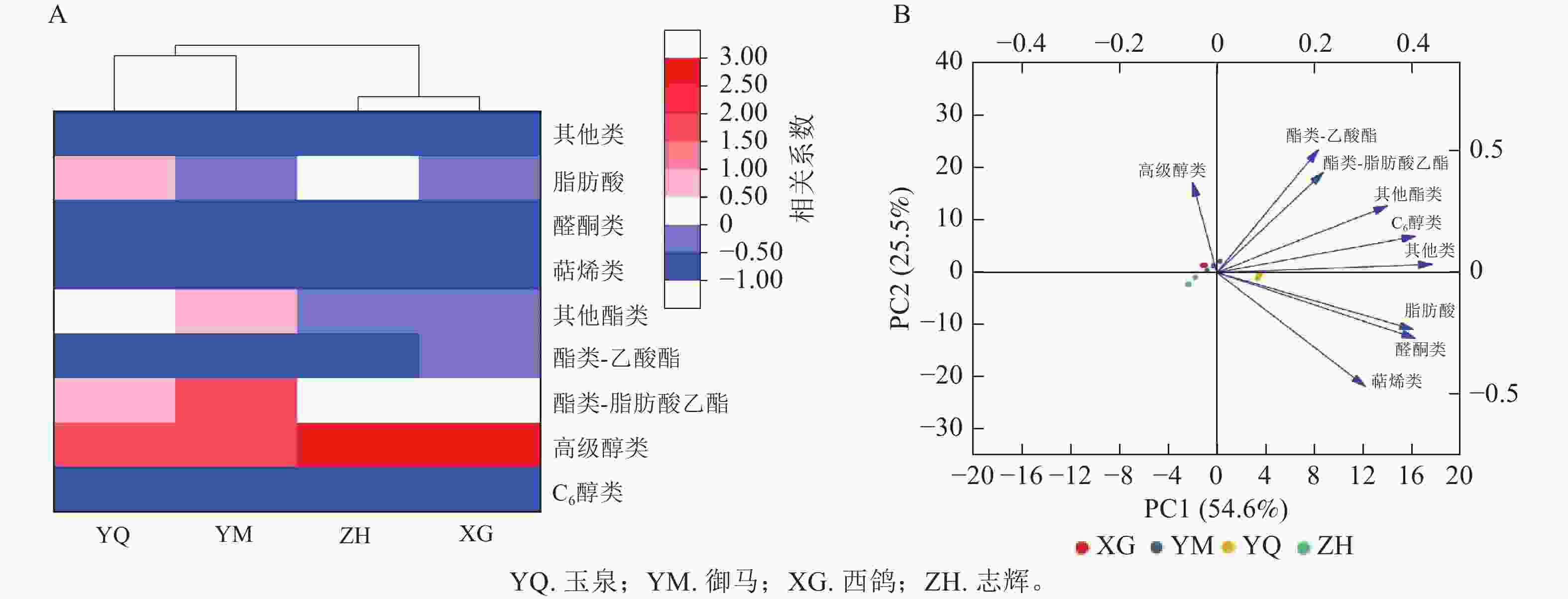 Figure 2. Cluster heat map (A) and principal component analysis (B) of aroma substance kinds of ‘Chardonnay’ wine samples