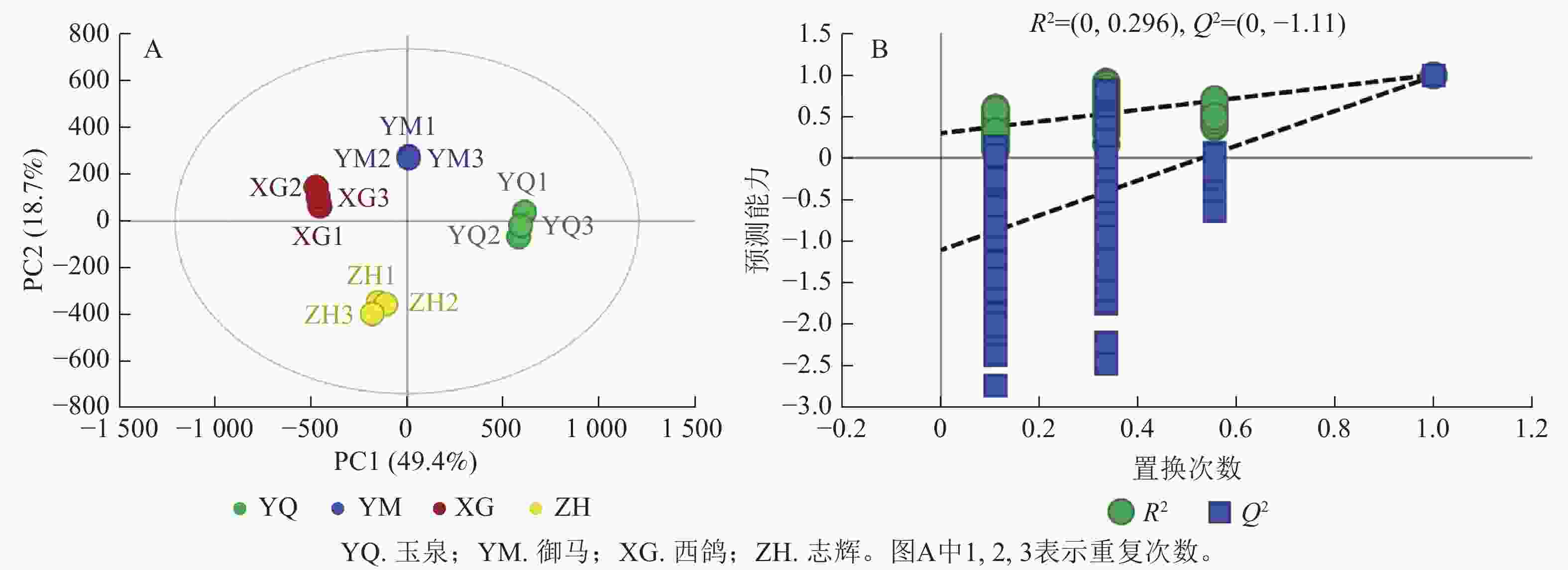 由图3可见:解释变量(R2x)和预测能力(R2y)分别为0.931和0.992,分类良好;预测能力核心指标(Q2)为0.957,预测能力强。主成分得分(图3A)可知:4个地块葡萄酒样明显分为4类,PC1与PC2累计贡献率为68.1%。玉泉聚于PC1正向端,志辉、西鸽位于PC1负向端;御马、西鸽位于PC2正向端,志辉位于PC2负向端,可有效区分。置换图(图3B)显示:模型无过拟合,区分能力强,可有效识别4个地块葡萄酒挥发性成分差异。