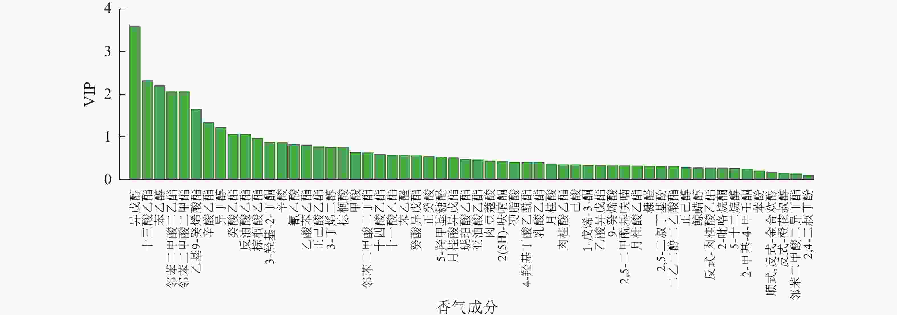 从变量投影重要性(VIP)分布(图4)可知:8种VIP>1的香气物质为地块区分关键,其中异戊醇(VIP=3.59)、十三酸乙酯(VIP=2.33)、乙基9-癸烯酸酯(VIP=1.65)、辛酸乙酯(VIP=1.35)、异丁醇(VIP=1.23)为御马、西鸽的主要特征物质;苯乙醇(VIP=2.21)、邻苯二甲酸二乙酯(VIP=2.06)、邻苯二甲酸二甲酯(VIP=2.05)为玉泉的主要特征物质。这8种物质可作为4个地块之间香气物质相互区分的主要标志物。