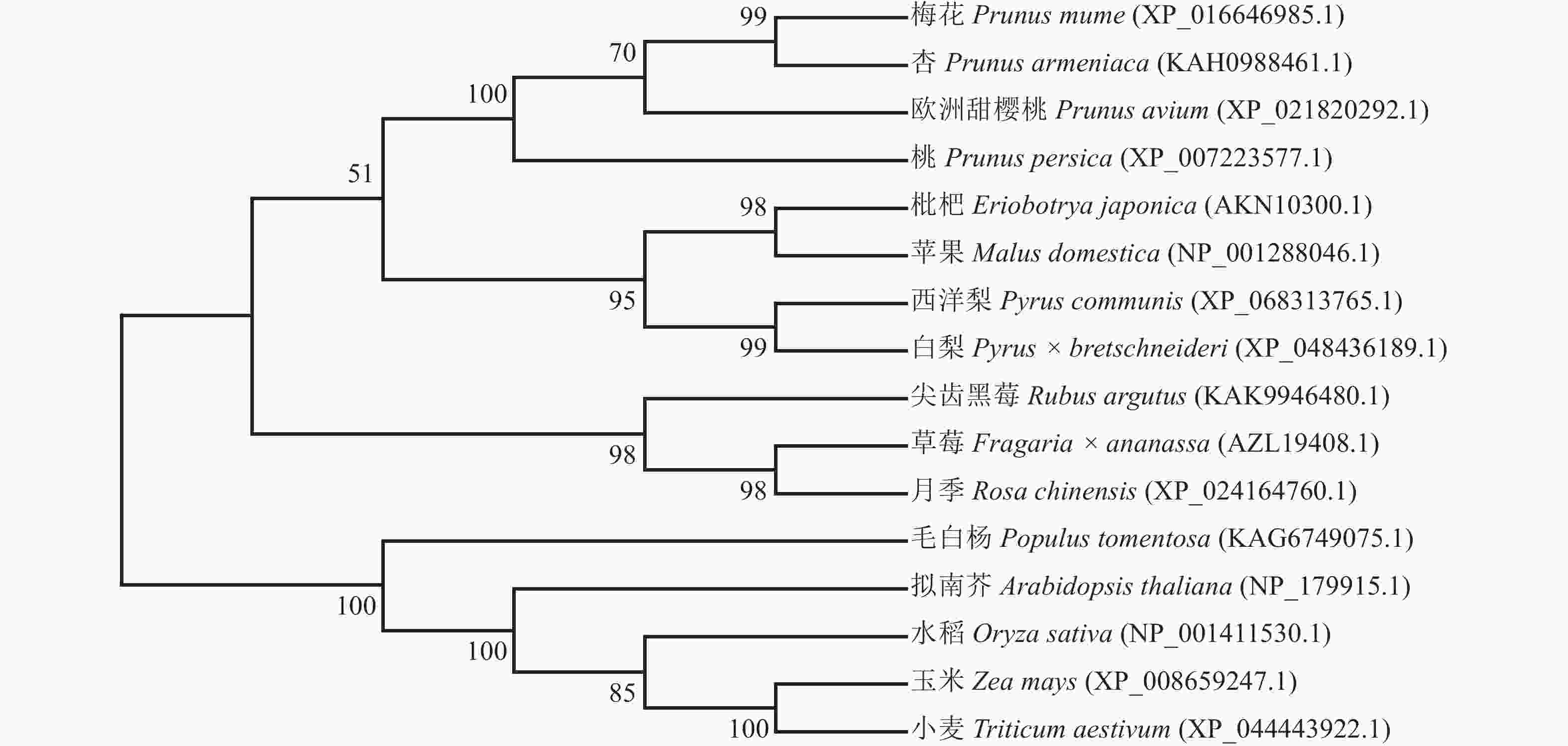 利用MEGA 7.0软件,采用邻接法构建PmERF011同源蛋白的多物种进化树,结果显示:PmERF011与杏ERF011处于进化树的同一分支上,两者亲缘关系最为接近,次之的是欧洲甜樱桃和桃,证实了蔷薇科李属内该基因的高度保守性;而与其他蔷薇科属(如草莓属Fragaria、梨属Pyrus、苹果属Malus等)及非蔷薇科物种(拟南芥、水稻、毛白杨等)的ERF011蛋白亲缘关系较远,反映了该基因在长期进化过程中可能产生的科属特异性分化(图4)。