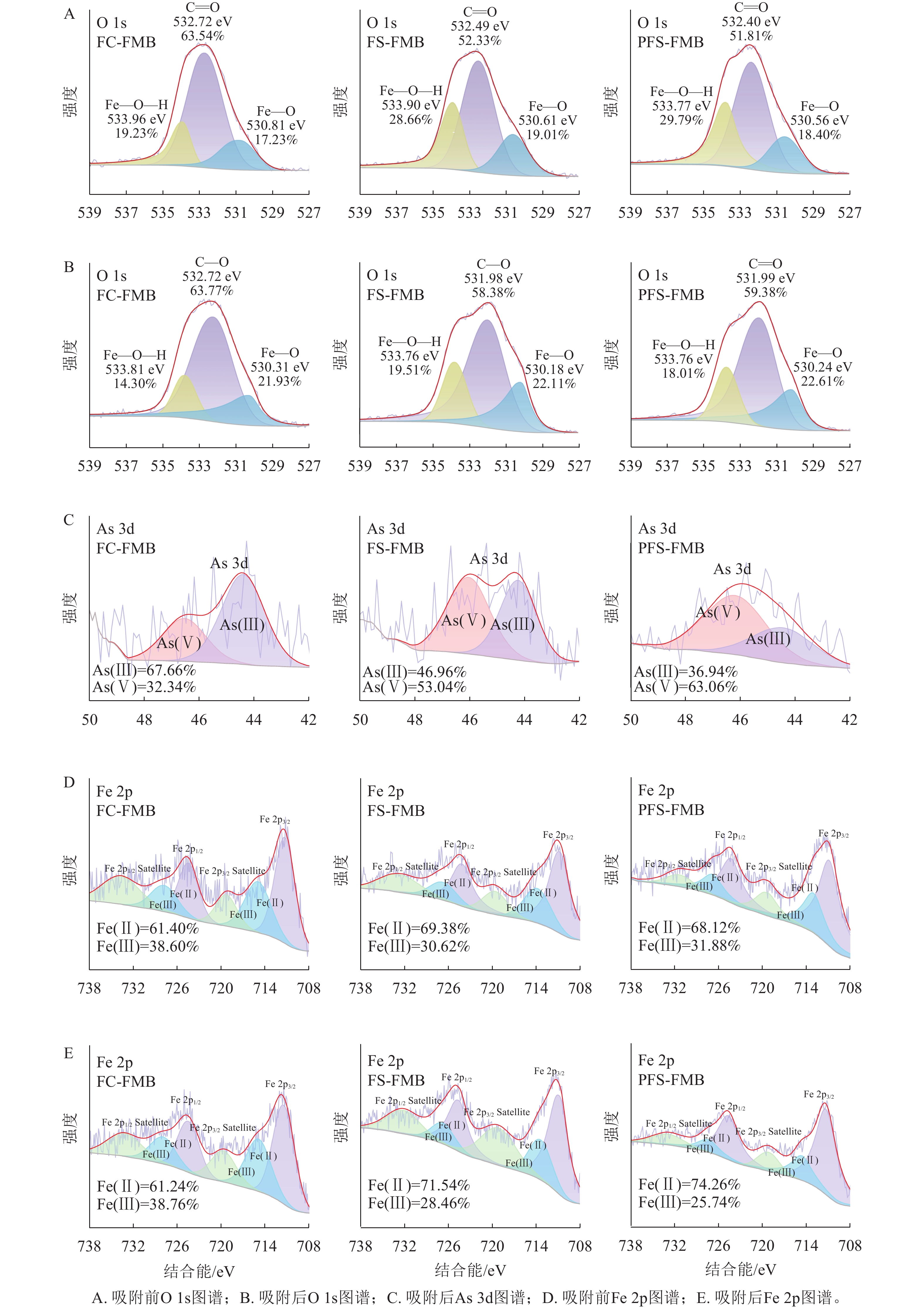 Objective The study aims to explore the potential and mechanisms of iron-based modification in enhancing the adsorption and immobilization capacity of biochar for As(Ⅲ), and construct an effective carbon sequestration and arsenic control system. Method The common garden waste Ficus microcarpa leaves was used as the raw material for making biochar. Batch adsorption experiments were conducted in combination with various analytical techniques, such as scanning electron microscopy-energy-dispersive spectroscopy (SEM-EDS), Fourier-transform infrared spectroscopy (FTIR), X-ray diffraction (XRD), and X-ray photoelectron spectroscopy (XPS). The structural properties of the raw biochar (FMB), ferric chloride-modified biochar (FC-FMB), ferric sulfate-modified biochar (FS-FMB), and polymerized ferric sulfate-modified biochar (PFS-FMB) were systematically investigated, along with their adsorption performance and mechanisms for As(Ⅲ) in aqueous solutions. Result Iron-based modification effectively increased the specific surface area of biochar by 3.36 to 4.22 times. Moreover, the modified biochar surfaces were enriched with more functional groups, and iron oxides were successfully loaded onto the biochar surface. At the pH value of 5, PFS-FMB achieved the highest removal rate of As(Ⅲ), reaching 91.16%, which was significantly higher than that of other biochar types. Adsorption kinetics analysis showed that the adsorption process of As(Ⅲ) followed the Elovich kinetic model, while the adsorption isotherms fitted well with the Langmuir isotherm model. The maximum adsorption capacities of 4 kinds of biochars for As(Ⅲ) from high to low were PFS-FMB (13.53 mg·g−1), FS-FMB (6.36 mg·g−1), FC-FMB (3.11 mg·g−1), FMB (1.29 mg·g−1). The adsorption of As(Ⅲ) by iron-based modified biochar was mainly chemical adsorption, which achieved through surface complexation. The adsorption mechanism involved the coordination between arsenite anions and iron oxides, as well as the complexation of surface hydroxyl functional groups. Conclusion Iron-based modified biochar is an efficient arsenic adsorbent, among which PFS-FMB demonstrated the best adsorption performance. [Ch, 9 fig. 3 tab. 50 ref.]