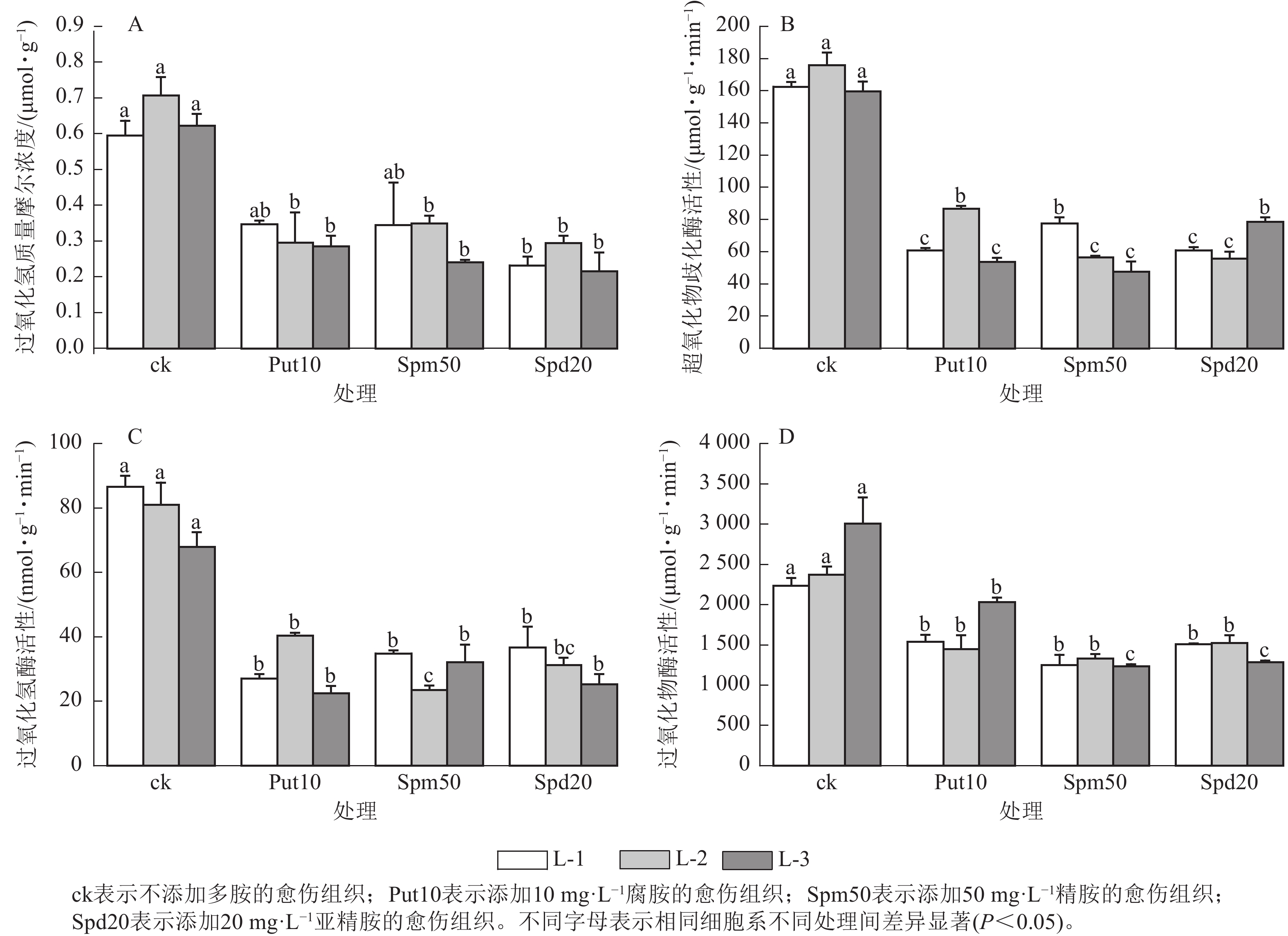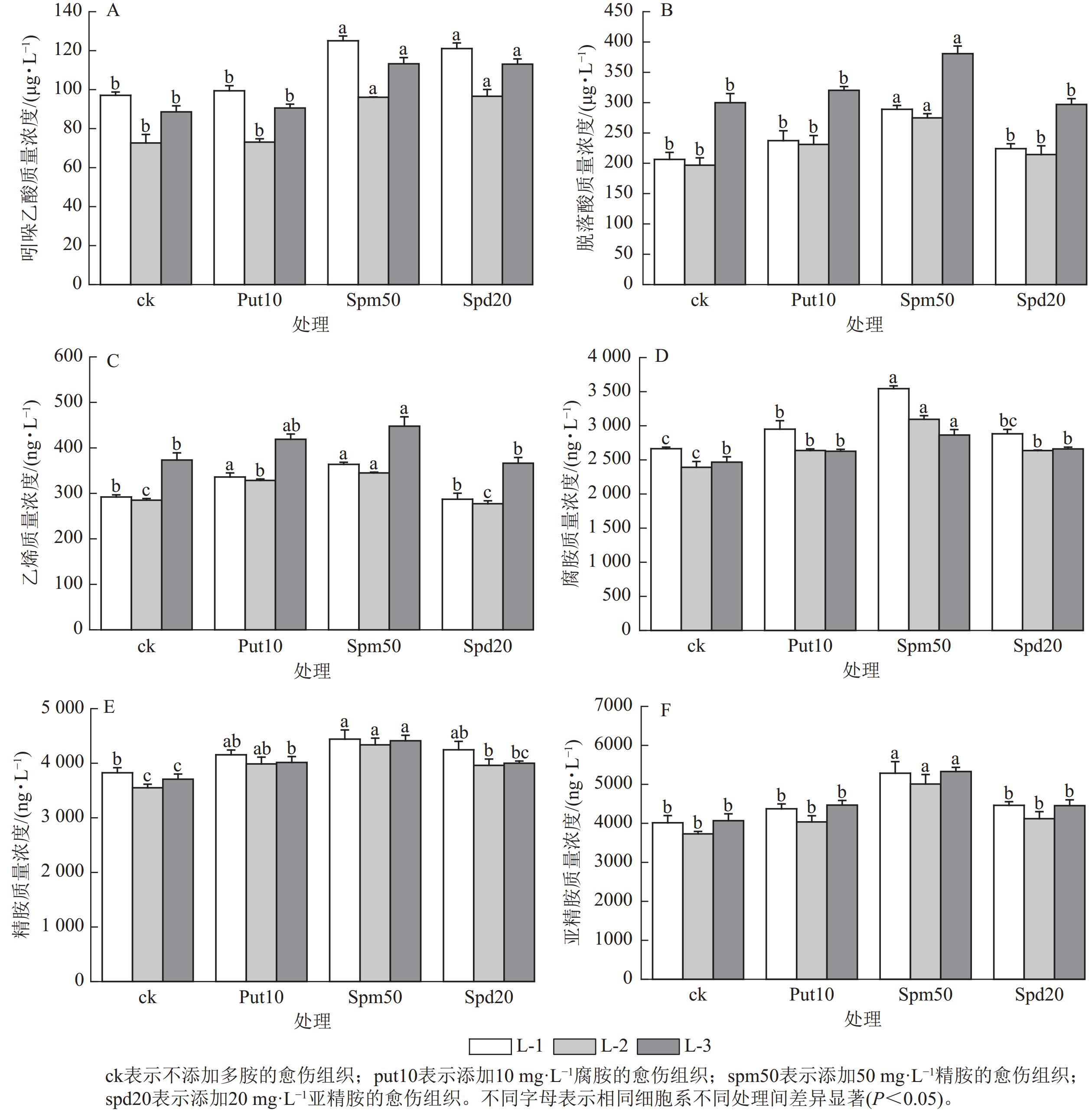 Objective To elucidate the physiological and biochemical effects of adding exogenous polyamines (PAs) on the embryogenic calli of Pinus koraiensis, which can enhance the proliferation ability of P. koraiensis embryogenic calli. Method By adding putrescine (Put), spermine (Spm) and spermidine (Spd) with different concentrations to the proliferation medium, the proliferation rate of embryonic calli were checked. The levels of hydrogen peroxide (H2O2), superoxide dismutase (SOD), catalase (CAT), peroxidase (POD), and indoleacetic acid (IAA), abscisic acid (ABA), ethylene (ETH) were analyzed. Furthermore, the dynamic changes of Put, Spm and Spd levels response to exogenous PAs were also determined. Result Exogenous PAs had a positive effect on the proliferation of embryogenic calli, with 5−30 mg·L−1 Put, 40−50 mg·L−1 Spm, and 10−20 mg·L−1 Spd exhibiting the most significant promoting effects. In the cultivation of three cell lines, 5−30 mg·L−1 Put increased proliferation by 2.22%−79.27%; 40−50 mg·L−1 Spm enhanced proliferation by 80.56%−141.12%; and 10−20 mg·L−1 Spd boosted proliferation by 61.25%−96.21%. Additionally, exogenous addition of PAs significantly reduced intracellular H2O2 content and antioxidant enzyme activities (P<0.05) while increasing endogenous PAs and hormone levels within the cells. Specifically, exogenous supplementation of 50 mg·L−1 Spm could notably elevate the levels of endogenous PAs and hormones (P<0.05). Exogenous addition of 10 mg·L−1 Put significantly increased intracellular ethylene and Spm contents (P<0.05), whereas exogenous supplementation of 20 mg·L−1 Spd effectively promoted the increase in IAA, Put, and Spm contents. Conclusion The addition of exogenous PAs at appropriate concentrations can elevate endogenous PAs levels, hormone content, and antioxidant capacity, thereby facilitating the proliferation of embryogenic calli in P. koraiensis. [Ch, 4 fig. 35 ref.]