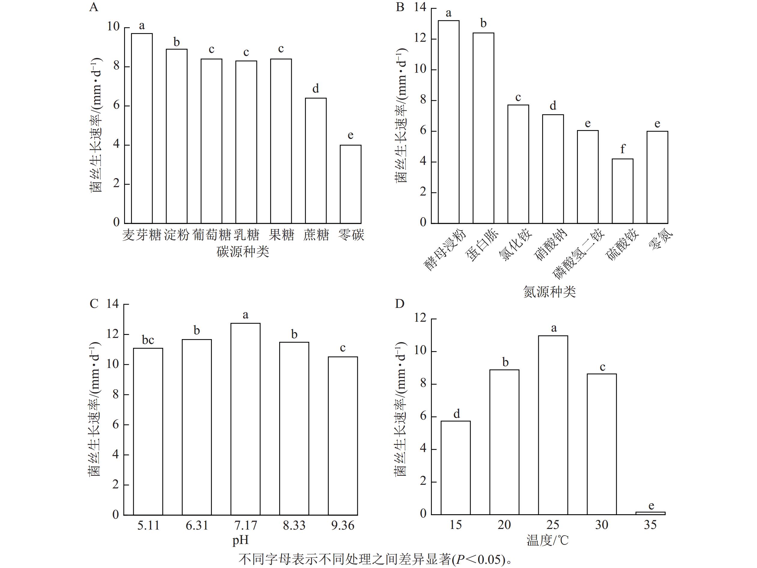 Objective This study aimed to identify the causal pathogen of branch blight in Rosa chinensis, characterize its biological properties, and evaluate effective fungicides to establish a scientific foundation for disease for disease control. Method The pathogen was isolated and purified using tissue isolation. The isolate was characterized morphologically and phylogenetically by multi-locus sequence analysis. Mycelial growth kinetics were assessed under varying carbon/nitrogen sources, pH values, and temperatures using the growth rate method. Five fungicides were evaluated for inhibitory effects by poisoned medium technique. Result The purified strain R1007 induced disease symptoms upon wound inoculation, and the same strain was re-isolated from infected tissues. Morphological characteristics matched Nectria ulmicola, and Blast analysis with phylogenetic analysis confirmed high genetic similarity to the type strain CFCC52117 of N. ulmicola. Optimal growth conditions were maltose (carbon source), yeast extract (nitrogen source), pH 7.17, and 25 ℃. Among tested fungicides, carbendazim showed the strongest inhibition (EC50=0.338 8 mg·L−1). Conclusion The causal agent of R. chinensis branch blight was identified as N. ulmicola. The optimal growth conditions were maltose and yeast extract as carbon and nitrogen sources, pH 7.17, and 25 ℃. Carbendazim shows promise as an effective fungicide for disease control. [Ch, 5 fig. 2 tab. 28 ref.]
