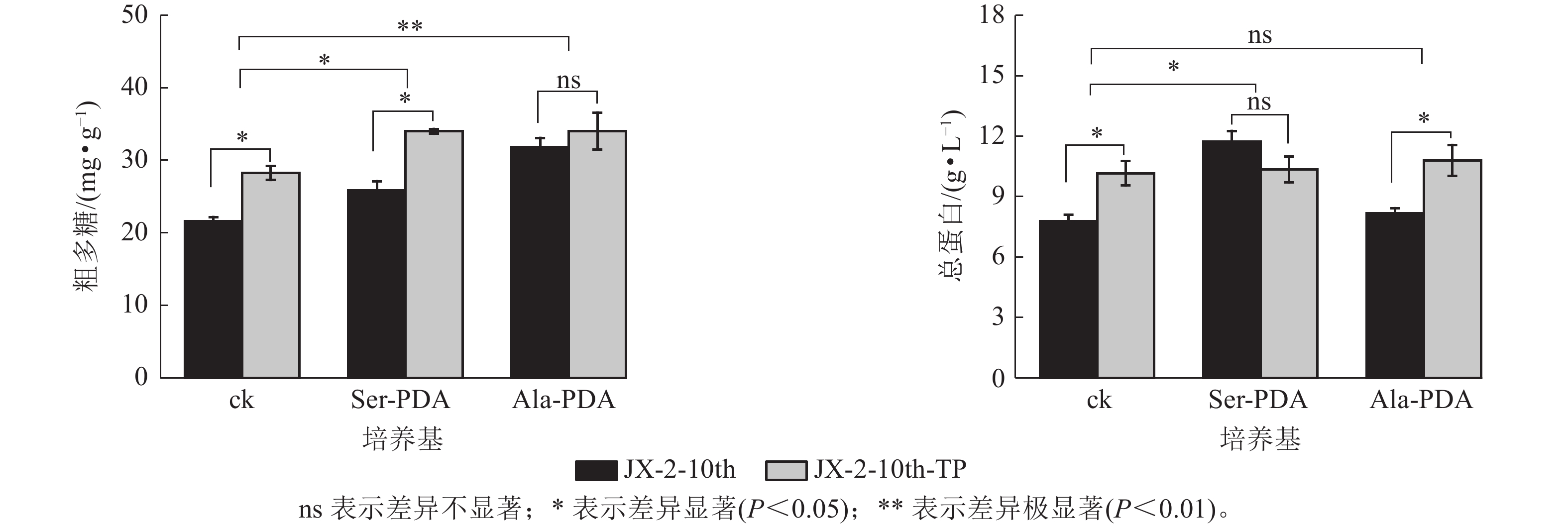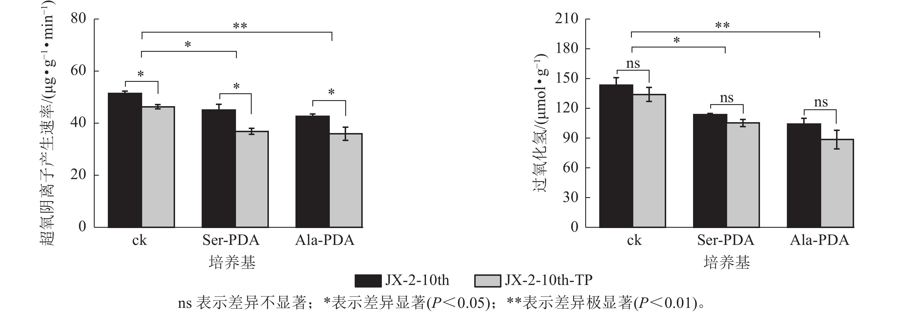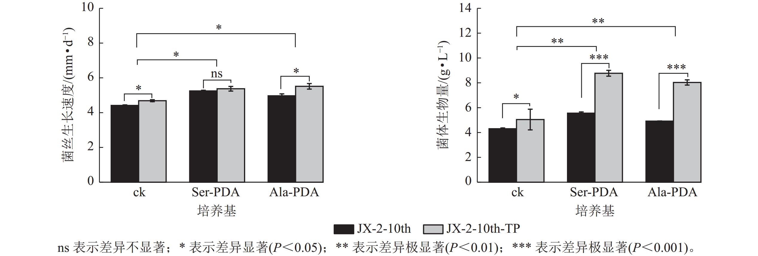 Objective This study aimed to investigate the effects of serine (Ser) and alanine (Ala) on strain degeneration and rejuvenation in Pleurotus pulmonarius, providing theoretical insights for mitigating the industrial bottleneck of strain stability and degeneration. Method Using the P. pulmonarius strain JX-2, a degeneration model was established through ten successive subcultures on potato dextrose agar(PDA) medium. Comparative cultivation experiments were performed with Ser- or Ala-supplemented media. Mycelial growth rate, biomass, and biochemical parameters (crude polysaccharides, total protein content) were systematically quantified. Changes in superoxide anion production rate, hydrogen peroxide (H2O2) content, and antioxidant enzyme activities were analyzed. The rejuvenation efficacy of hyphal tip purification was evaluated across different media (PDA, Ser-PDA, Ala-PDA). Result Continuous subculturing induced strain degeneration. The 10th-generation strain exhibited a 15.45% reduction in growth rate and 28.67% biomass decrease compared to initial generations. Ser or Ala supplementation effectively delayed degeneration and maintained mycelial vitality. Hyphal tip purification significantly reversed degenerative traits. In PDA medium, this method increased biomass by 17.17%, elevated crude polysaccharides and total protein content by 30.66% and 30.50%, respectively, and enhanced antioxidant capacity [peroxidase (POD) activity +84.20%; superoxide dismutase (SOD) activity +20.07%]. Ser-PDA medium demonstrated superior rejuvenation effects, achieving 57.77% biomass increase and 63.70% SOD activity enhancement. Ala-PDA medium specifically boosted total protein content by 32.01%. Conclusion Subculturing frequency critically drives P. pulmonarius strain degeneration. Media supplementation with 2 g·L−1 Ser or Ala substantially mitigates this process. Hyphal tip purification synergized with amino acid-enriched media achieves targeted rejuvenation efficiency: Ser-PDA preferentially enhances antioxidant defenses, while Ala-PDA specifically promotes protein biosynthesis. [Ch, 5 fig. 33 ref.]