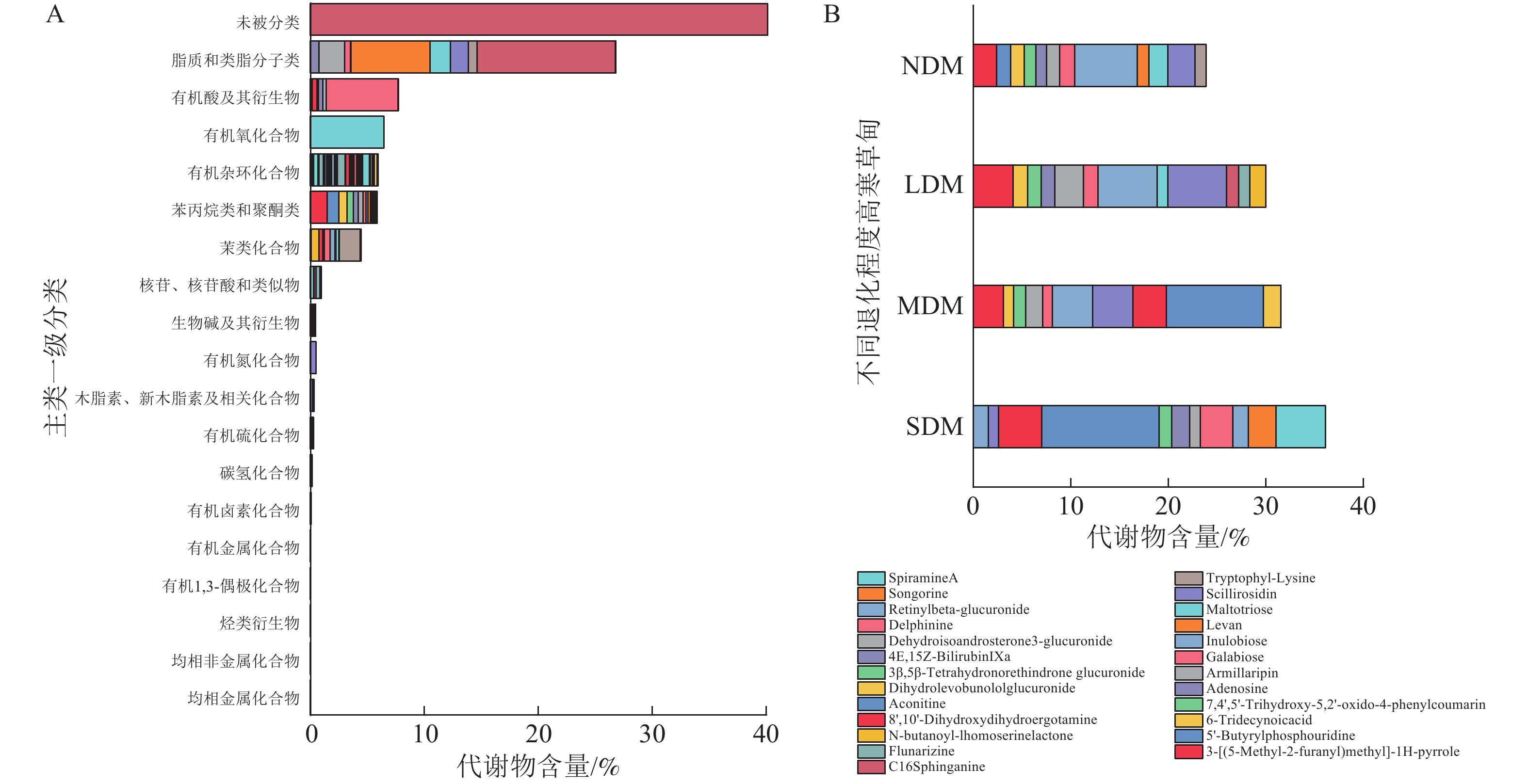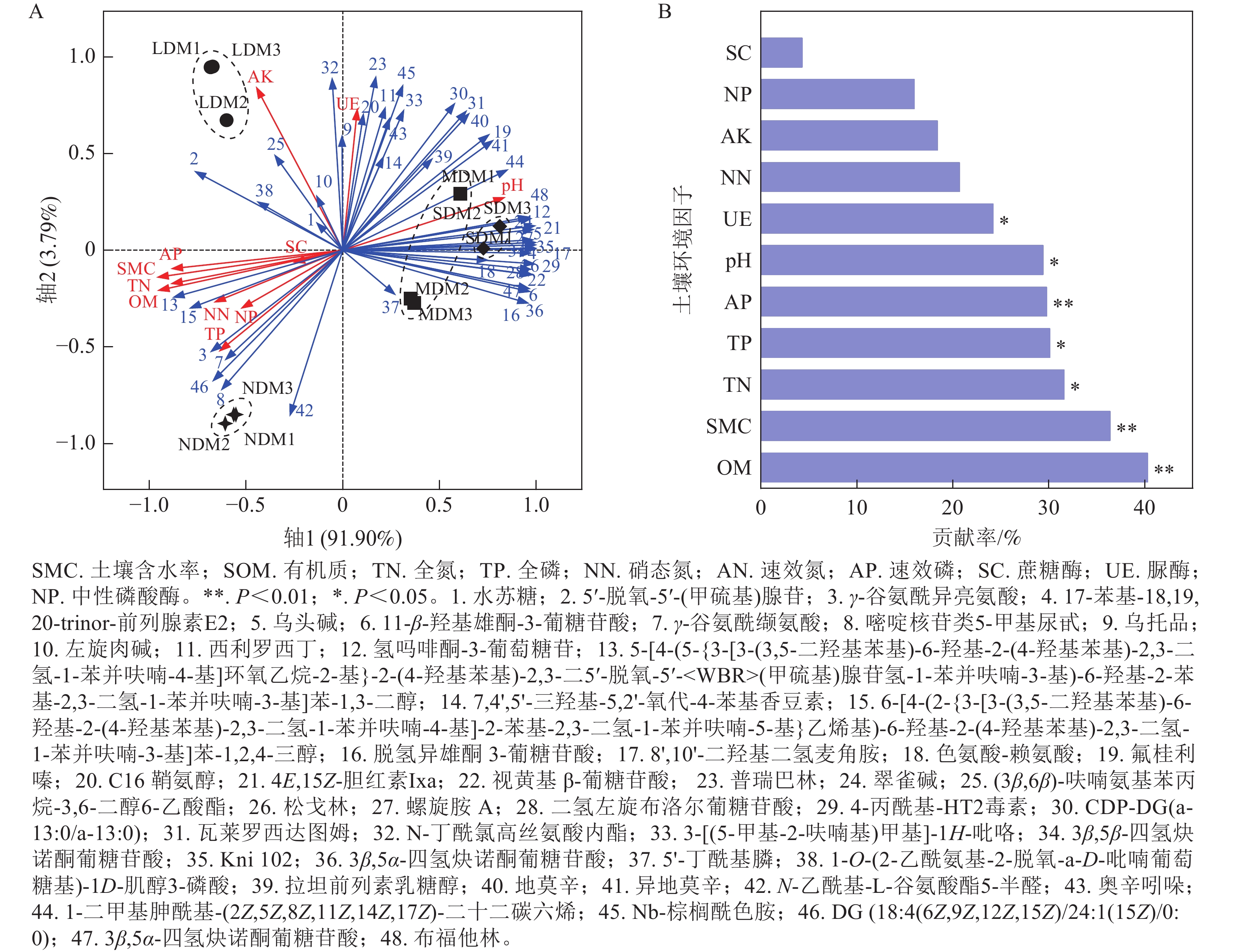 Objective This study examines soil metabolite variations in degraded alpine meadows of the Three-River Source region, identifies key metabolic pathway shifts, and assesses their correlations with soil environmental factors. The findings provide scientific insights into degradation drivers and soil ecological responses. Method This study focuses on alpine meadows in Sanjiangyuan National Park, Maqin County, Guoluo Tibetan Autonomous Prefecture, Qinghai Province. It uses untargeted LC-MS/MS metabolomics to analyze soil metabolites across a degradation gradient, including non-degraded, lightly degraded, moderately degraded, and severely degraded meadows. The study also examines correlations between key differentially expressed metabolites and soil environmental factors. Result A total of 8 451 metabolites were identified, with lipids and lipid-like molecules being the most abundant (26.81%). Soil degradation significantly altered metabolite types and contents, with the most significant differences observed between heavily degraded and other meadow types. The top 20 signature metabolites included carboxylic acids, fatty acyls, organic nitrogen compounds, and sphingolipids. Key metabolic pathways affected were linoleic acid metabolism, ABC transporters, phospholipase D signaling, and sphingolipid signaling. Redundancy analysis revealed significant correlations between soil metabolites and environmental factors such as organic matter, water content, total nitrogen, total phosphorus, pH, and urease activity. Conclusion The types of signature metabolites, differentially expressed metabolites, and major metabolic pathways in alpine meadow soils varied significantly across degradation levels. These variations were hypothesized to correlate strongly with changes in environmental factors such as soil organic matter, water content, total nitrogen, total phosphorus, pH, and soil urease. [Ch, 6 fig. 2 tab. 55 ref.]